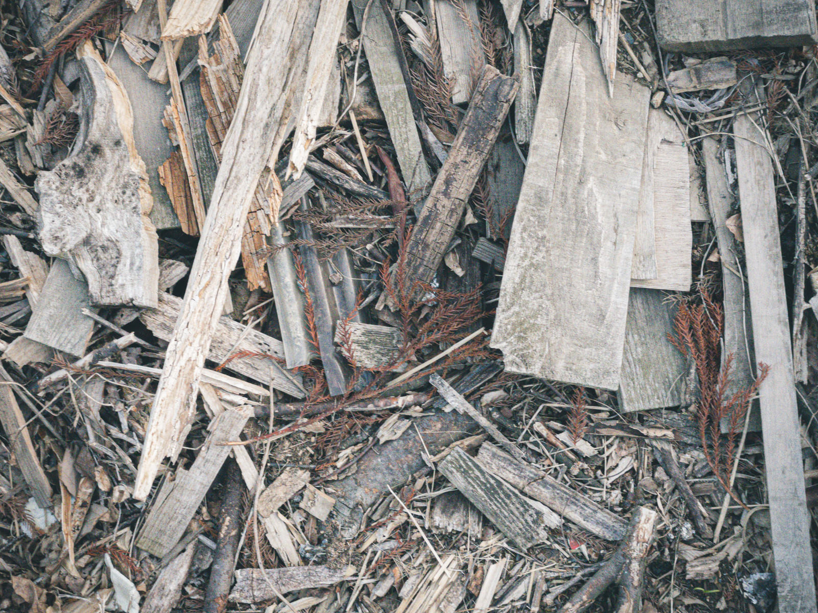 細かい廃材のテクスチャーの写真素材です。木材の破片や瓦礫が不規則に積み重なり、茶色を基調とした複雑な質感を形成しており、凹凸と色のバリエーションが豊富です。背景デザインや素材表現などにおすすめです。