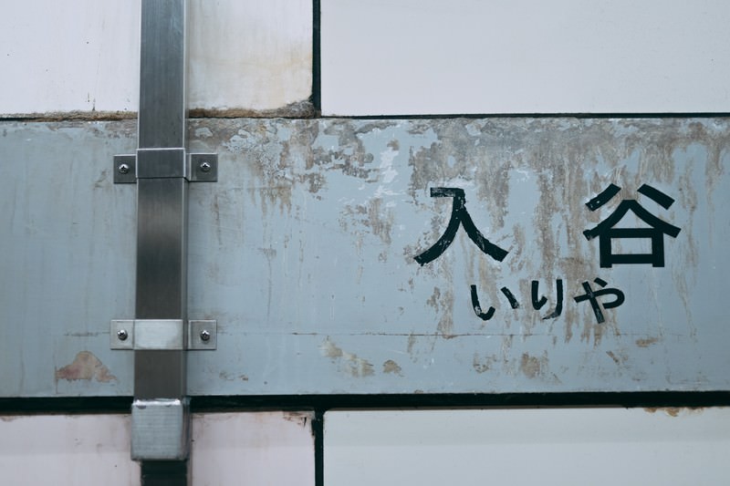 入谷の看板の写真素材です。白い背景に青い文字で「入谷」と書かれた案内標識で、街に設置されている地域表示です。地域の案内表示や街並み関連のコンテンツ制作に活用できます。
