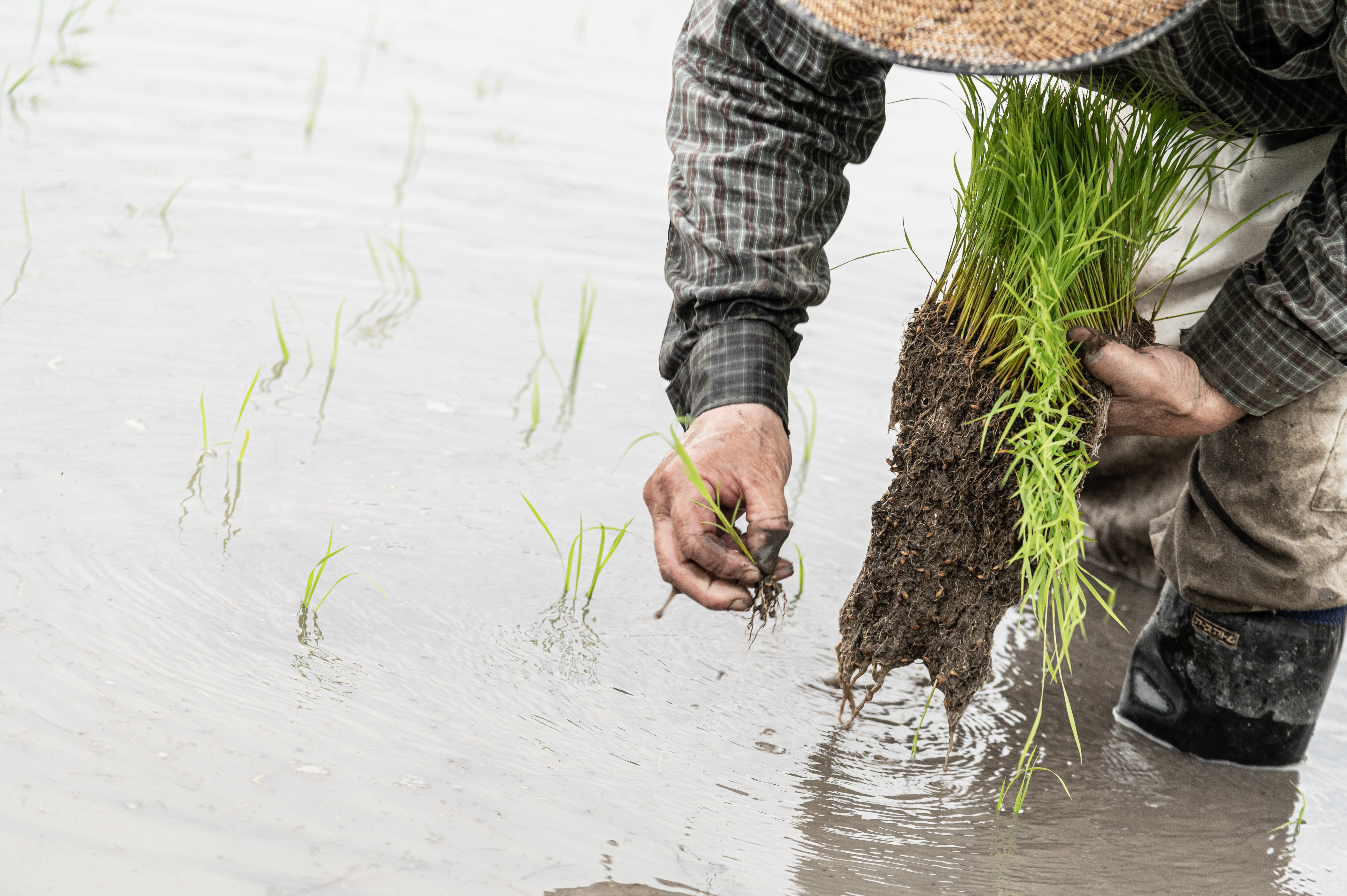 田植えをする農家の写真素材です。水田で稲の苗を丁寧に植える農家の手元が写されており、緑の稲苗と泥の質感が表現されています。一本ずつ丁寧に植える農作業の情景が記録されており、農業関連の記事やパンフレット、田植え体験のPRなどにおすすめです。