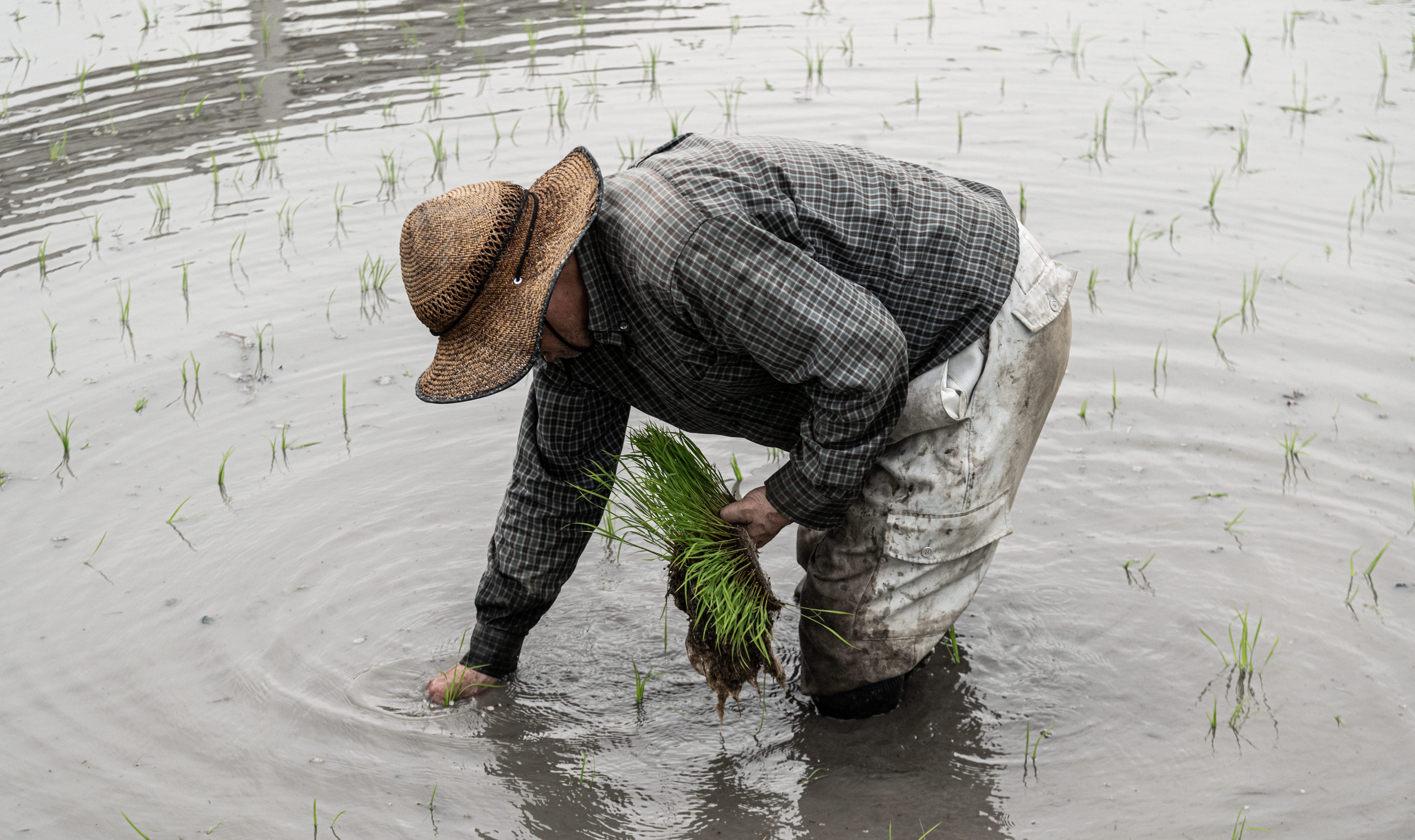 水田で中腰になって田植えをする男性の写真素材です。帽子をかぶった男性が腰をかがめて水田に丁寧に稲の苗を植えており、春の農繁期における農家の日々の作業風景が記録されています。農業関連の資料や広報物、農業情報のコンテンツ制作などにおすすめです。