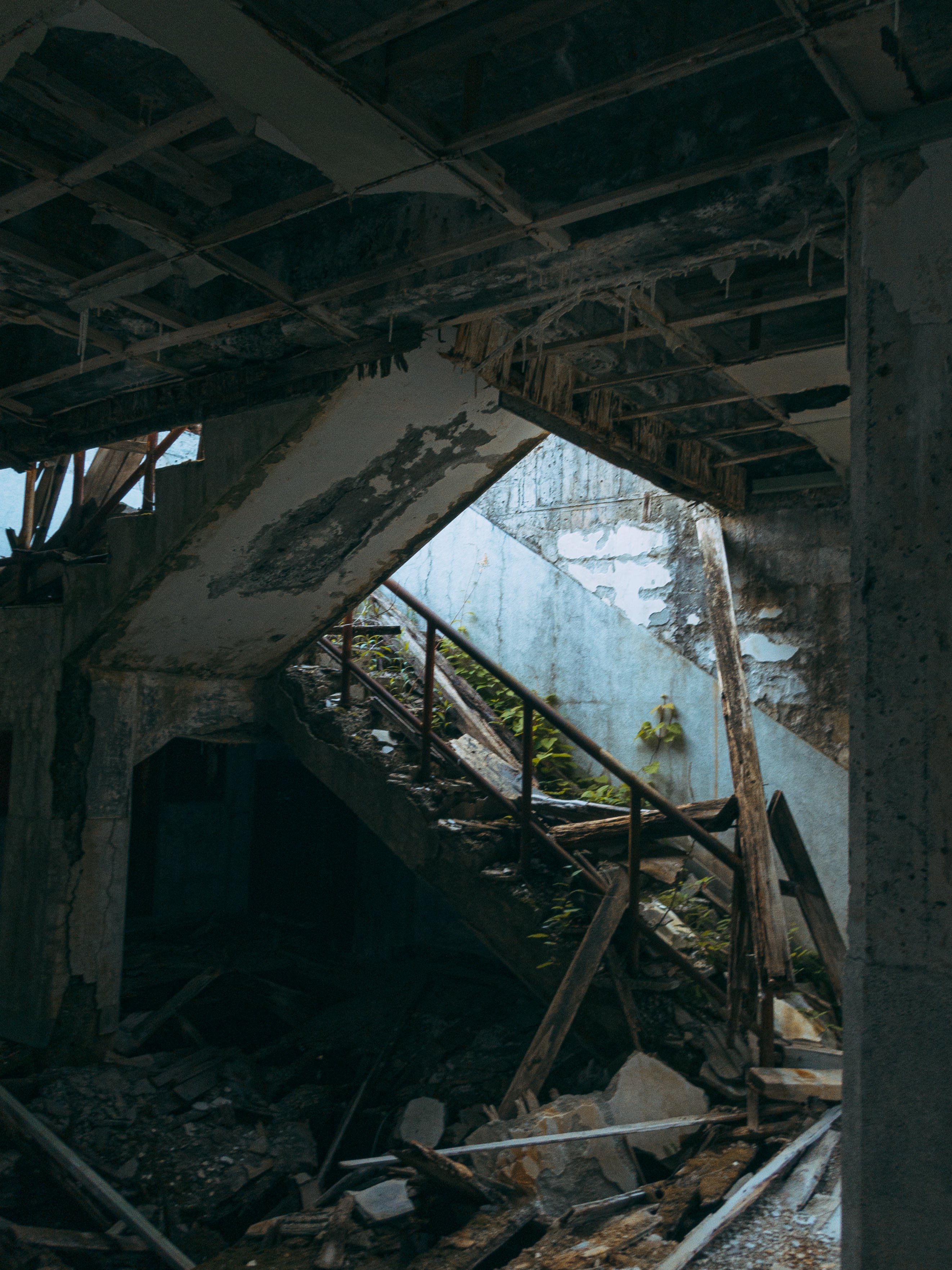 ボロボロに倒壊した廃墟の写真素材です。天井が崩れ落ち、瓦礫が散乱し、壁や床が損傷した状態が記録された、廃病院などの打ち捨てられた建物の内部風景。ホラー映画やゲームの背景素材、廃墟探索コンテンツなどにおすすめです。
