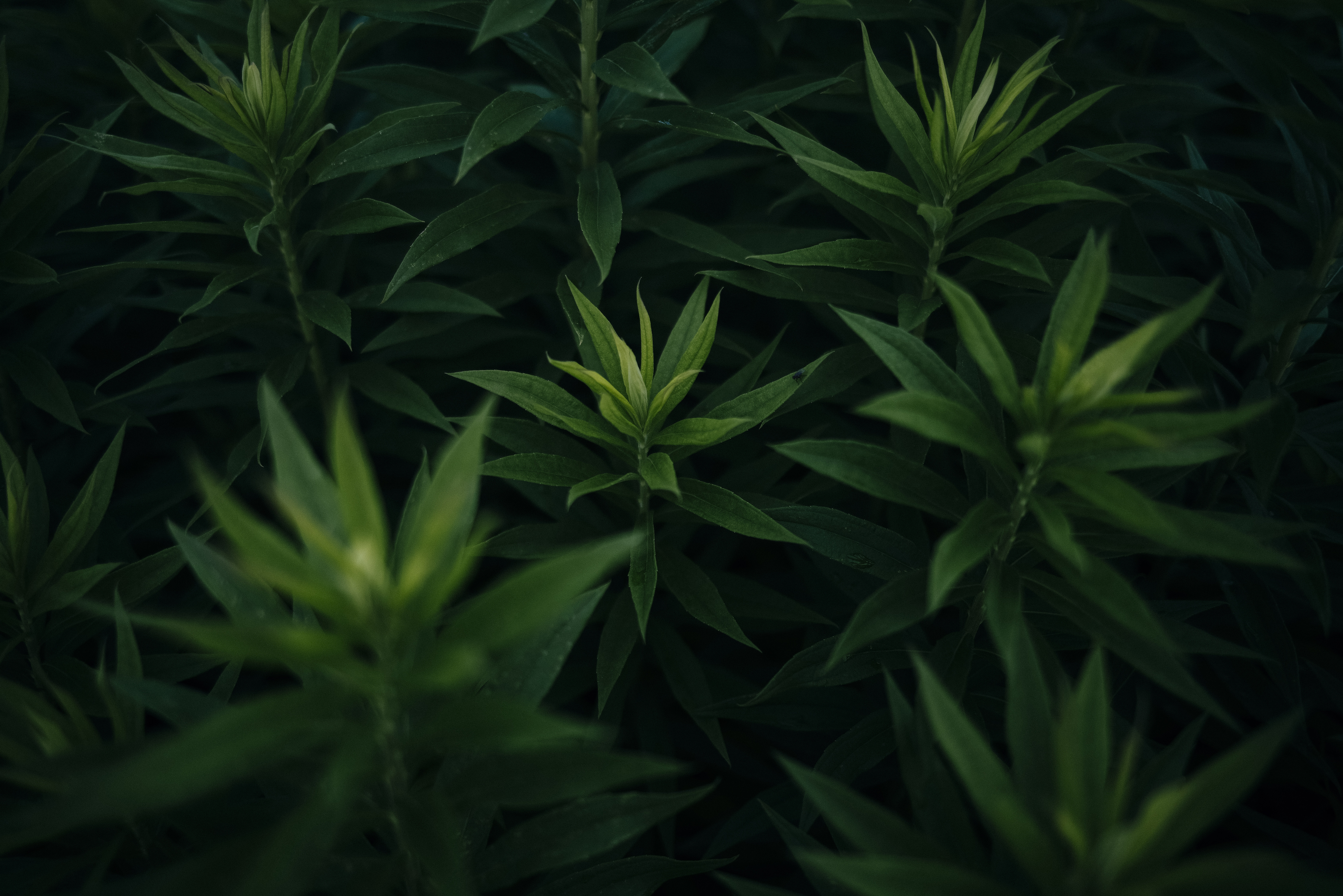 Young shoots of tall fleabane emerging in the darkness