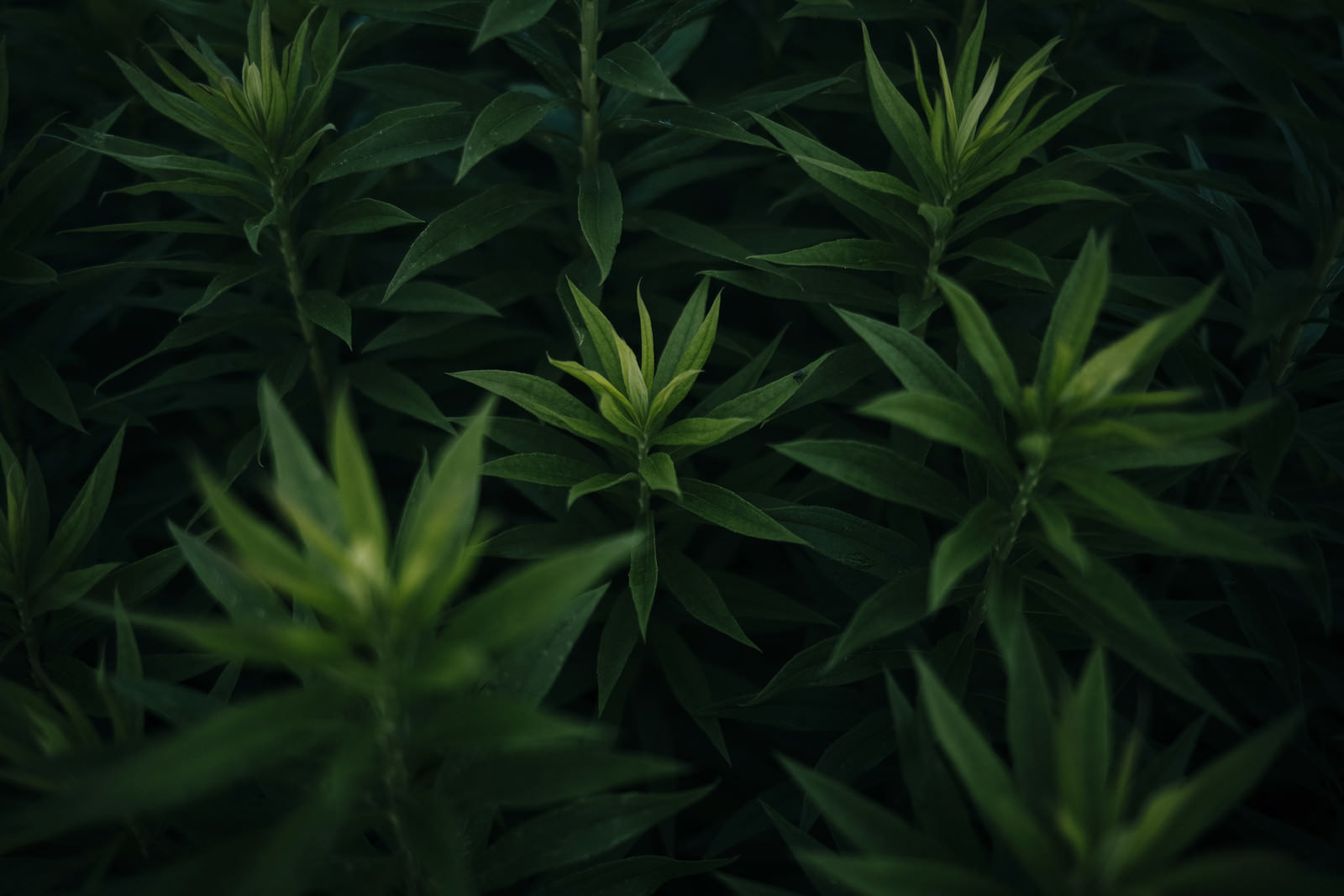 暗がりに浮かぶオオアレチノギクの若芽の写真素材です。キク科の雑草であるオオアレチノギクが、放射状に広がる若い葉を幾重にも重ねて生育する成長過程を撮影しています。植物図鑑や自然観察の資料などにおすすめです。