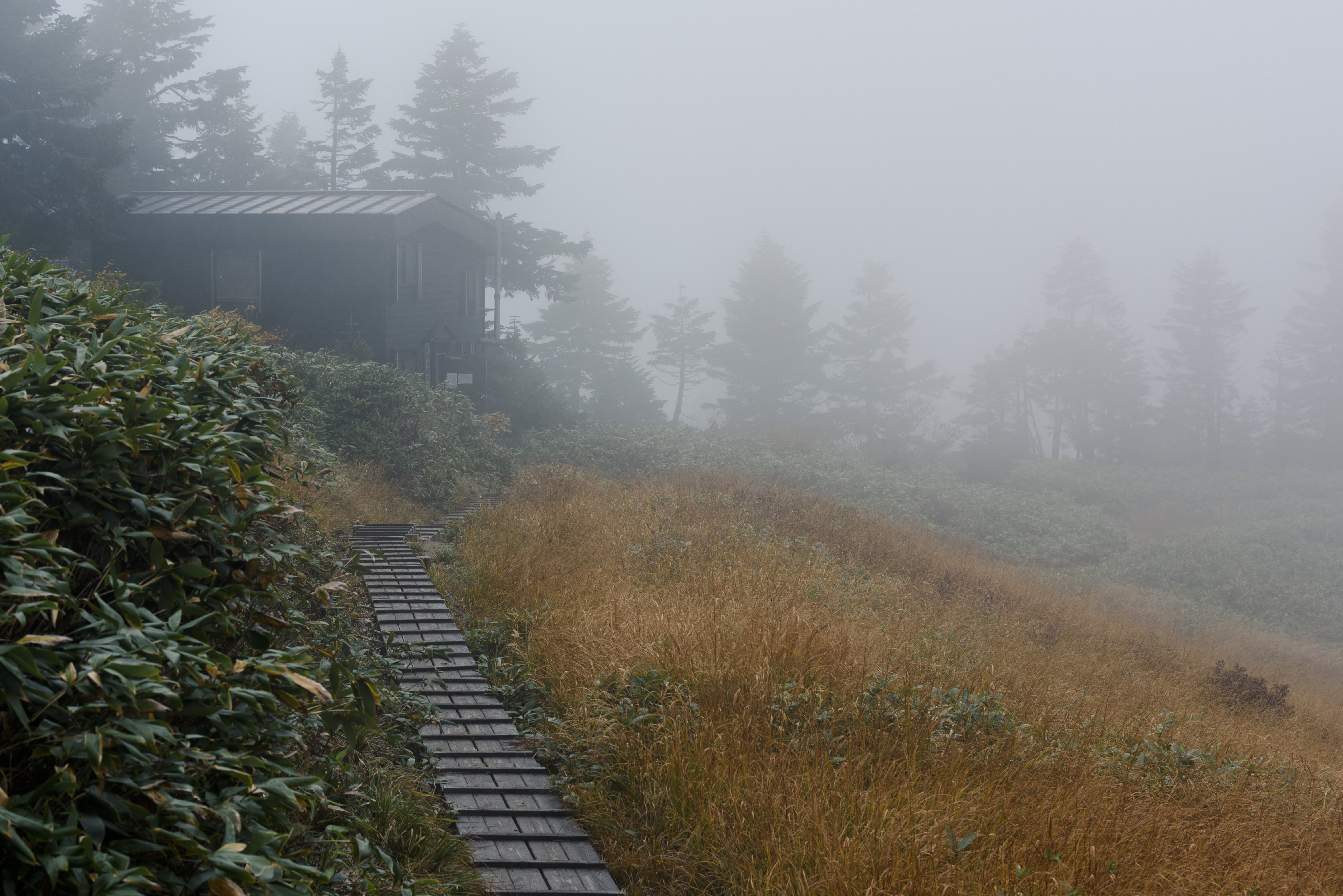 霧がかかった巻機山の木道と避難小屋の写真素材です。板張りの歩道が奥へと続き、脇には枯れた草地が広がり、針葉樹林と建物が霧の中にぼんやり見える。登山やハイキング関連のWebサイト、山小屋・山岳記事の制作などにおすすめです。