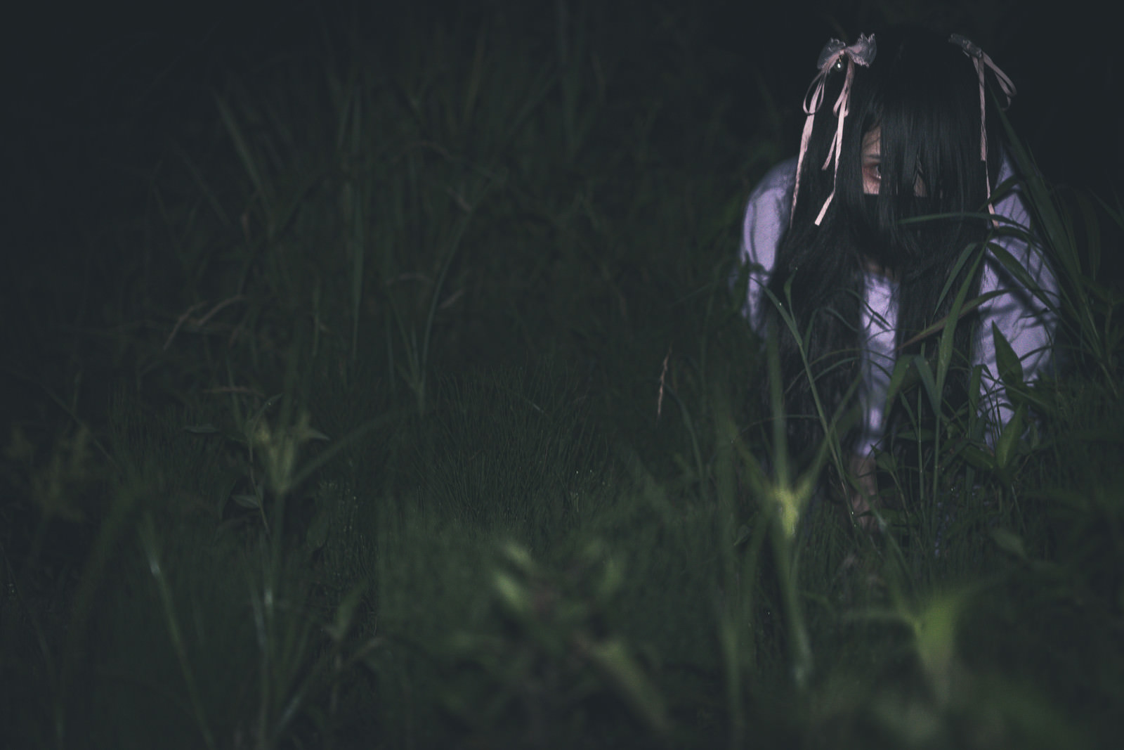 草むらから這い出してくる地雷系女子の写真素材です。長い髪の女性が暗い草むらから這うように現れ、貞子のようなジャパニーズホラー的な恐怖的雰囲気を表現しています。ホラー系のコンテンツ制作や映像演出、怪談関連の素材として活用できます。