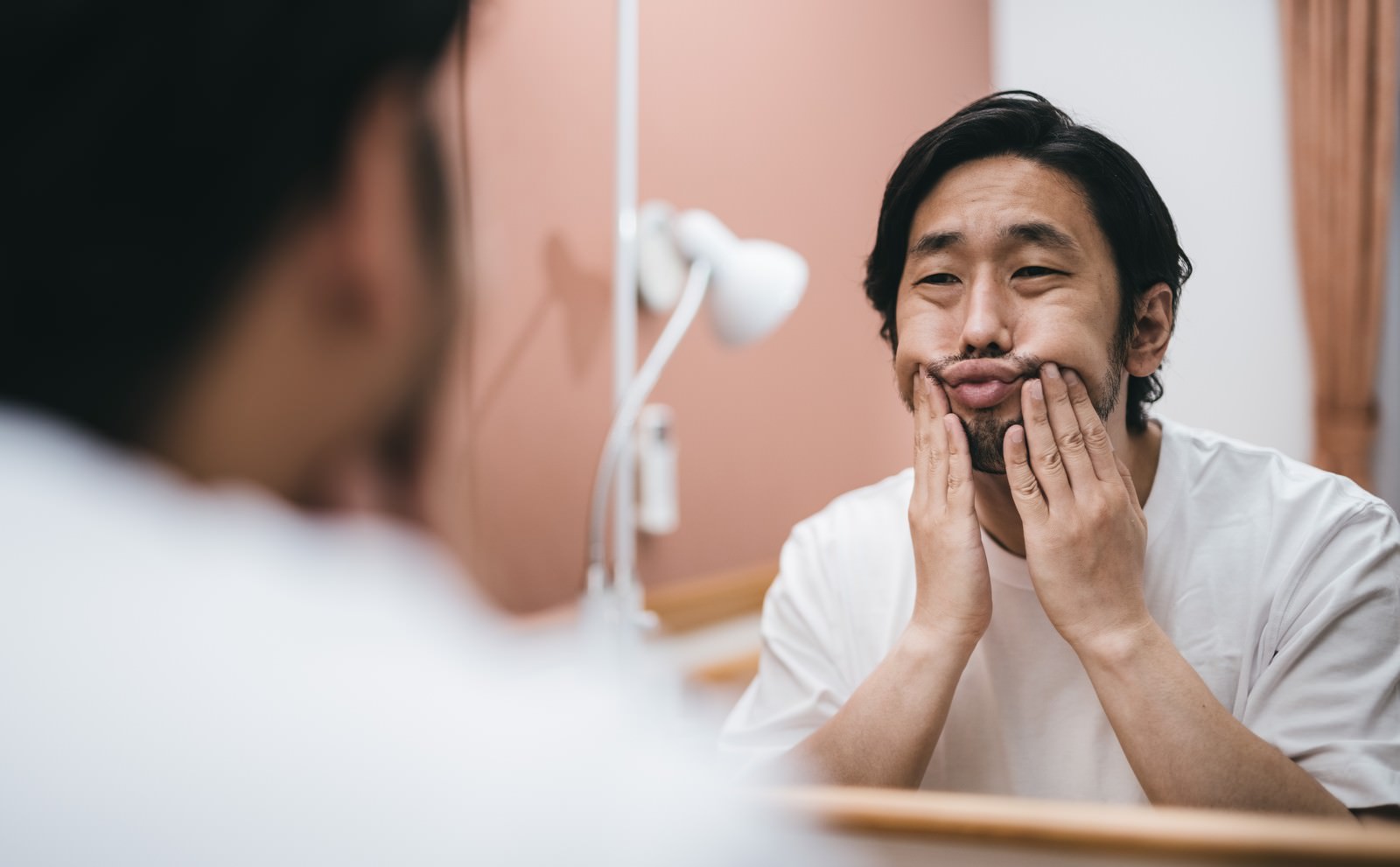 鏡の前で両手で頬を触りながら自分の顔を確認している男性の写真素材です。無精髭が生えた顎まわりに手を当て、口をすぼめた表情で鏡を見つめている。メンズスキンケアや髭ケア関連のコンテンツにおすすめです。