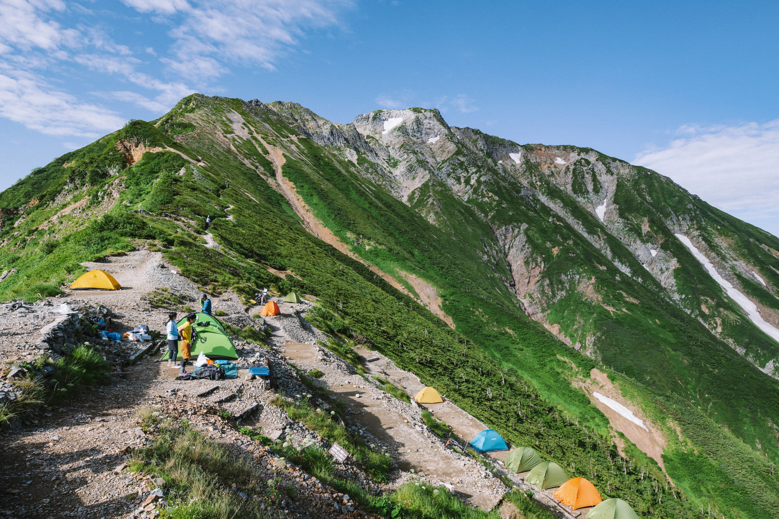 五竜山荘周辺にテントを張る登山者たちと背景にそびえる五竜岳の写真素材です。緑の稜線に赤や黄色、青などのカラフルなテントが点在し、登山者らがテント設営や休憩をしている様子が映っています。登山やアウトドア、キャンプ関連のWebサイト、ブログ記事などにおすすめです。