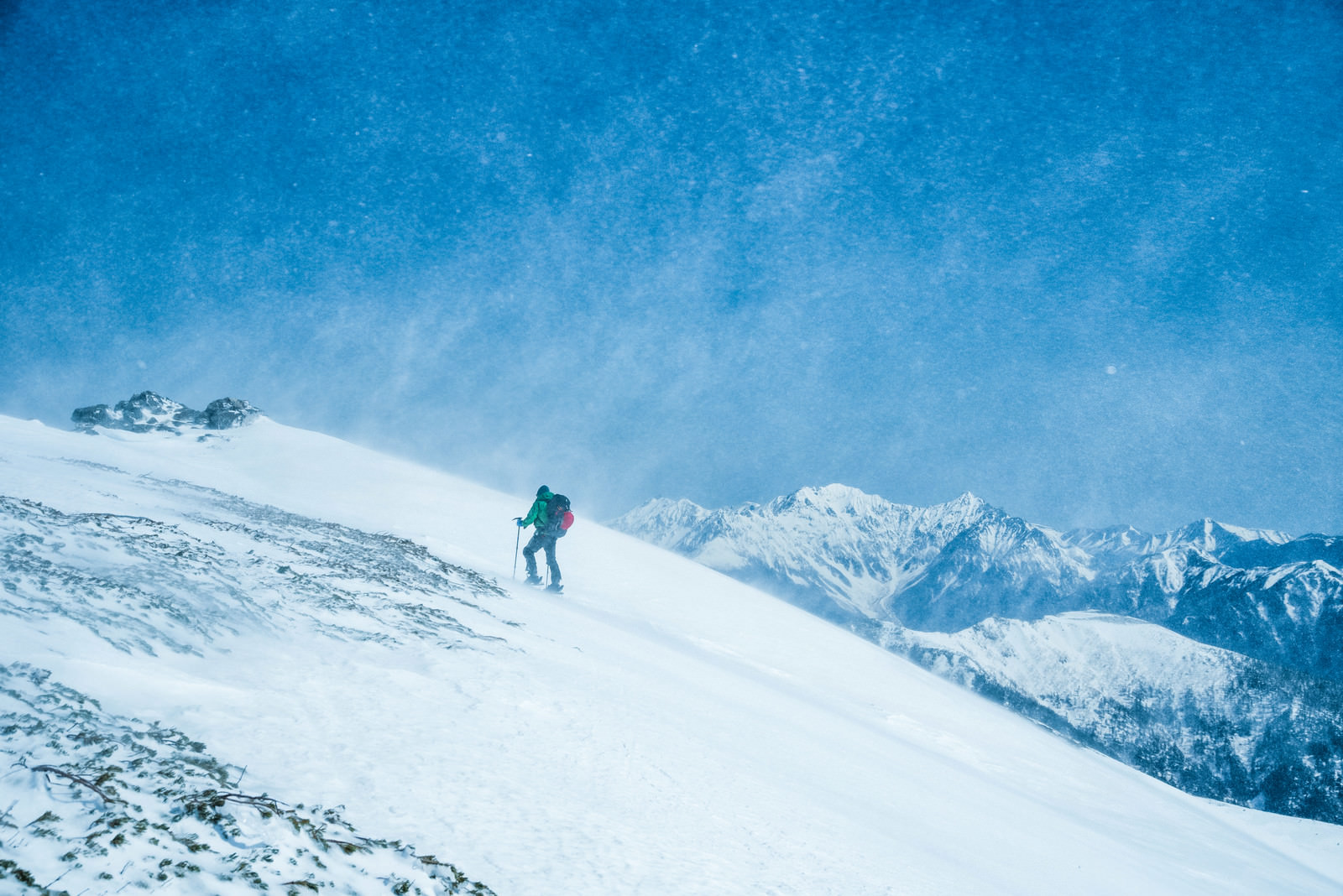舞い上がる雪と山スキーヤーの写真素材です。雪化粧した山々を背景に、青空の下でスキーヤーが雪煙を上げながら滑走する光景を収めています。雪山での山スキーの迫力ある動きと冬の自然の美しさが調和した一枚で、冬の山岳地帯での活動を紹介するコンテンツ制作におすすめです。