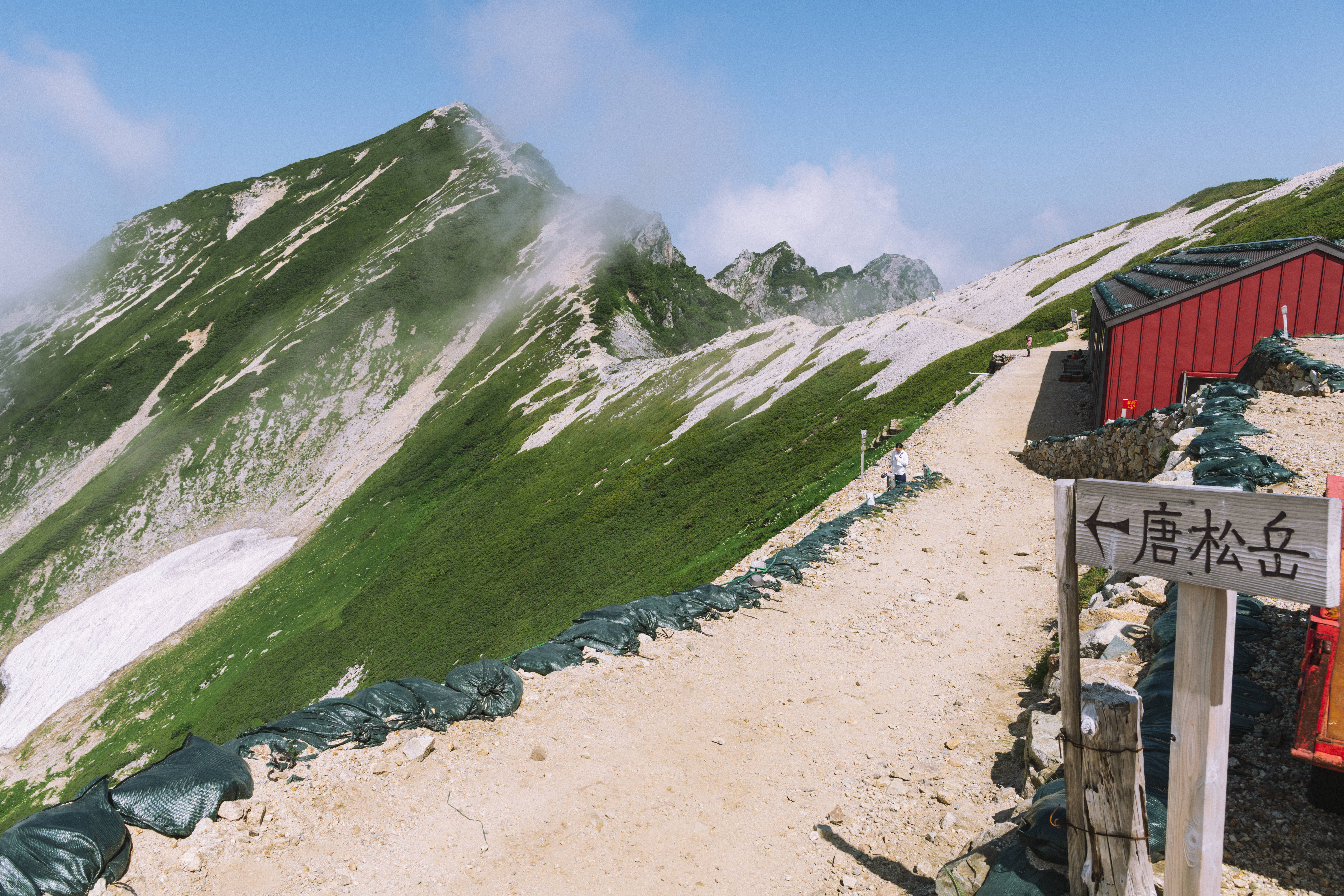 五竜岳と唐松岳を結ぶ稜線の写真素材です。赤い屋根の山小屋と指導標が設置された登山道があり、北アルプスの百名山に選ばれた山々が連なる景観を捉えています。登山情報サイトやアウトドア関連のWebコンテンツ制作に最適です。