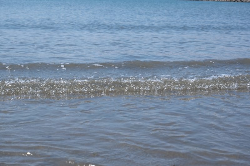 屏風ヶ浦の小さな波打ち際の写真素材です。穏やかな海面から打ち寄せた波が砂浜に流れ込み、さざ波が光に反射する情景を映しています。海岸風景やビーチの背景素材、自然風景の利用におすすめです。