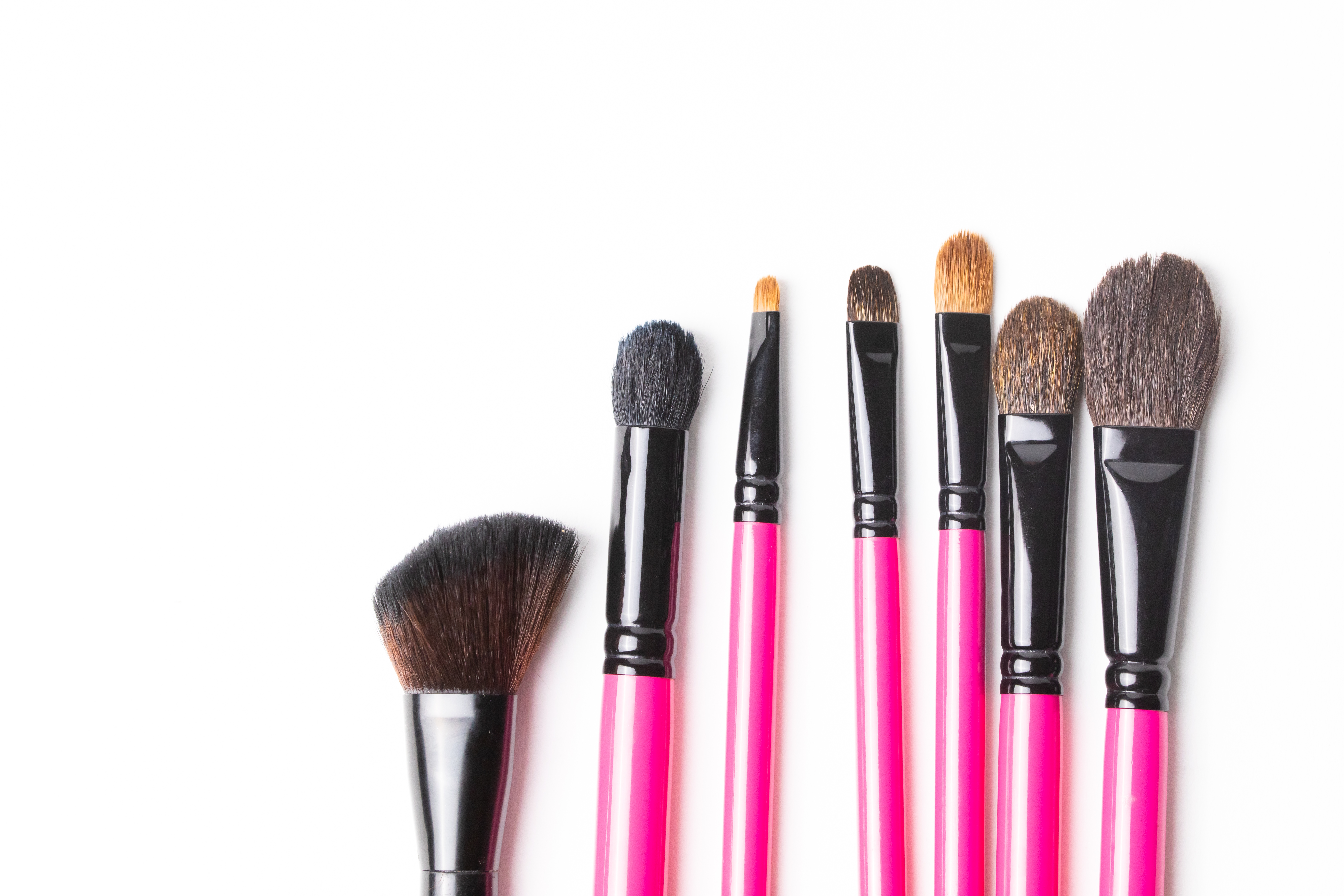 メイクアップブラシセットの写真素材です。ピンク色の柄を持つ化粧筆が複数本並んでおり、ファンデーション用やアイシャドウ用などの異なる種類のブラシが揃っています。毛質や形状の違いを比較できる内容で、メイク関連の記事やコスメ解説、商品紹介などにおすすめです。