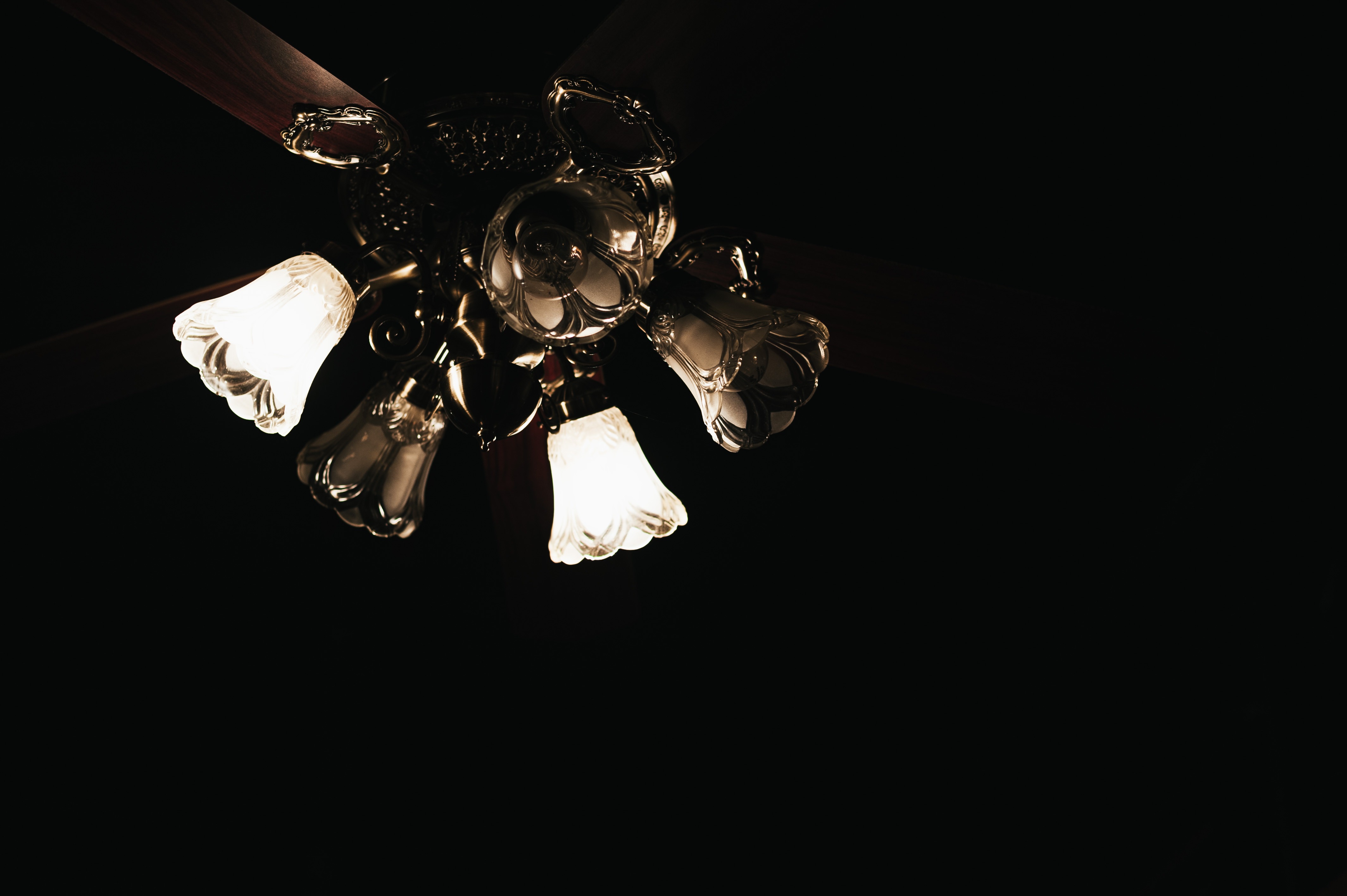 暗闇に浮かぶシャンデリアの写真素材です。複数の電球が温かな光を放ち、装飾的な照明デザインを引き立たせています。レストランやホテルなどの高級感のある店舗空間の雰囲気演出に活用できます。