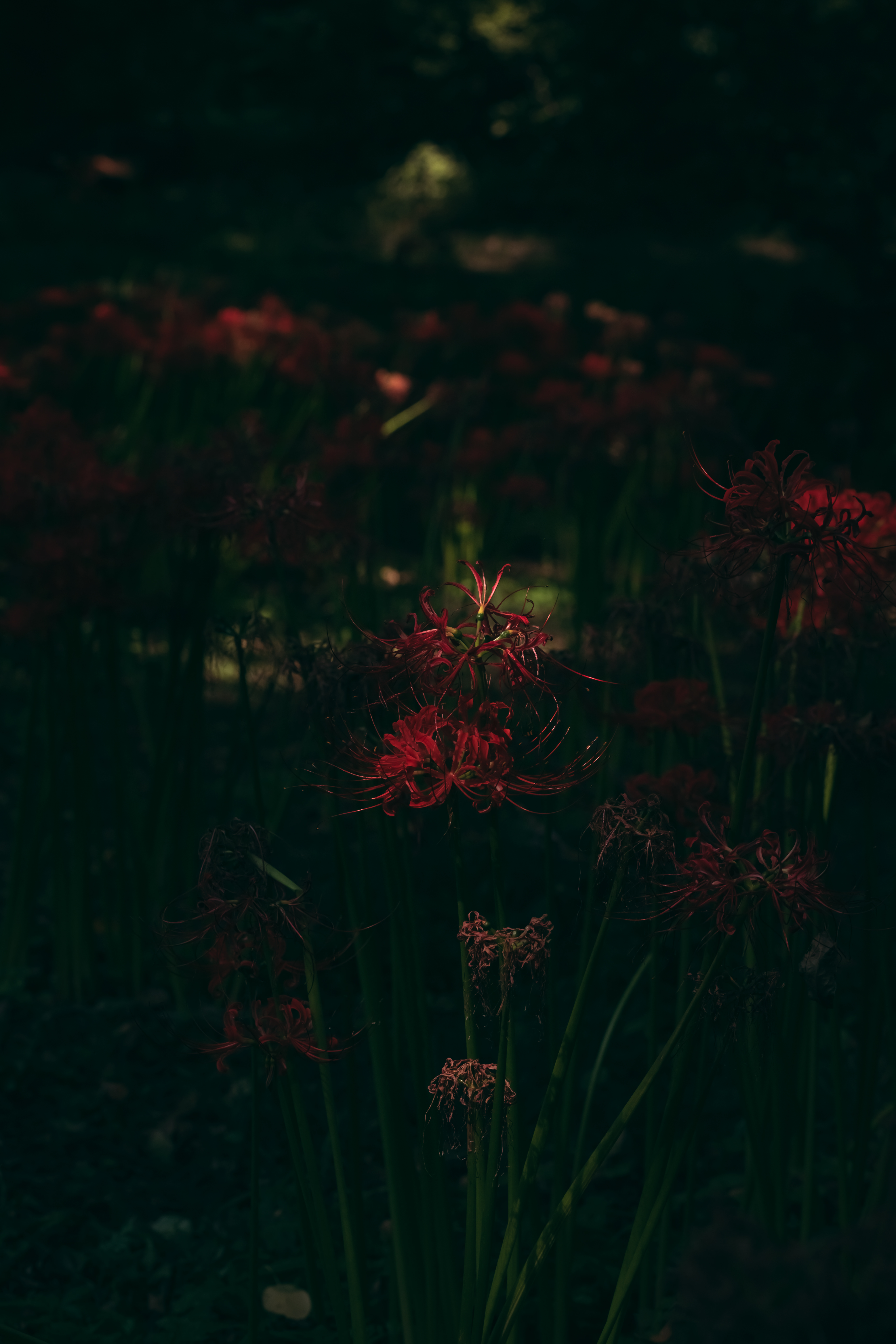 Red Spider Lilies Blooming in the Dim Forest