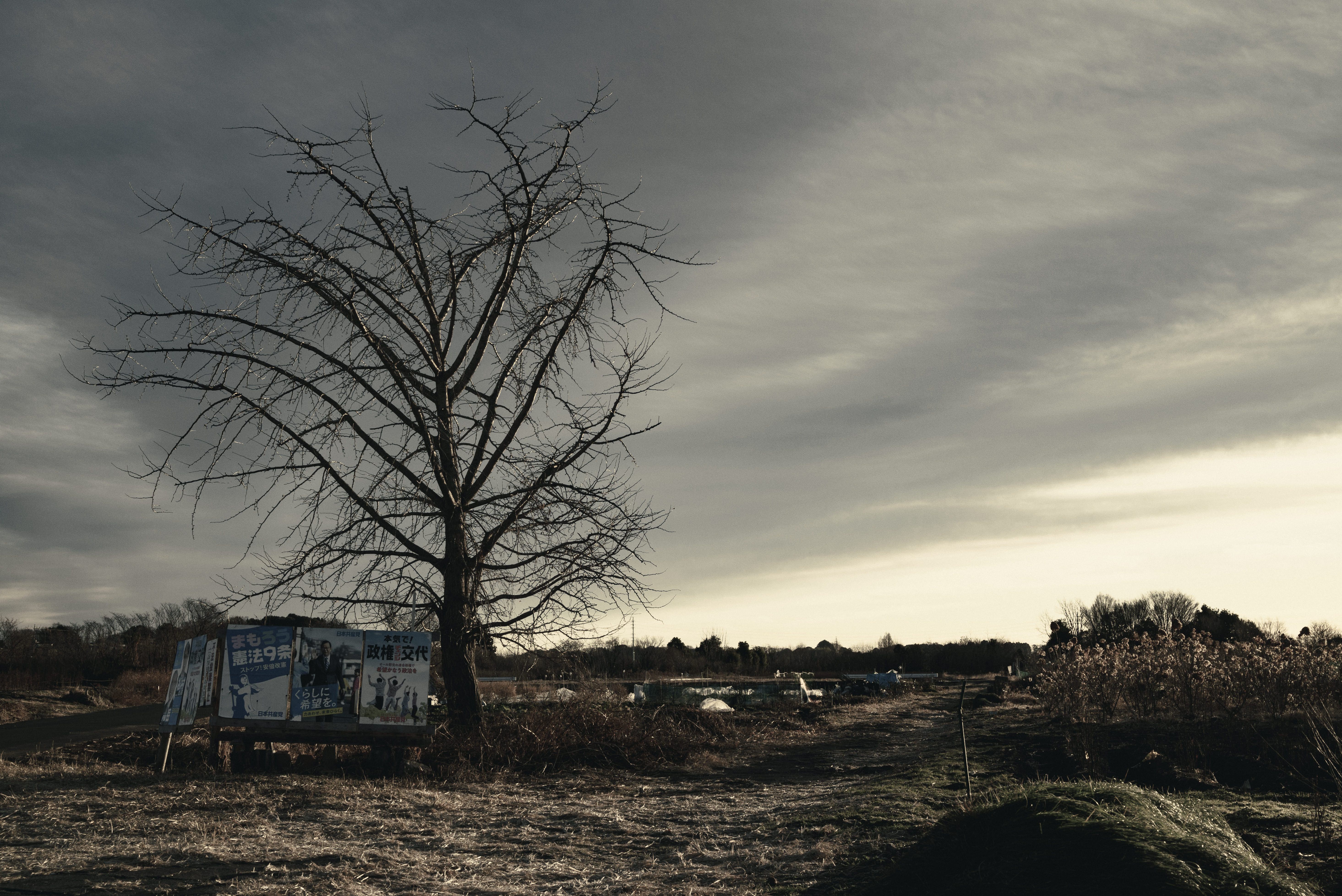 農地に残された一本の枯れ木の写真素材です。葉を落とした裸木が荒地に立ち、曇り空が広がる冬の田舎風景を表現しています。季節素材や自然の変化を表現するデザインなどにおすすめです。