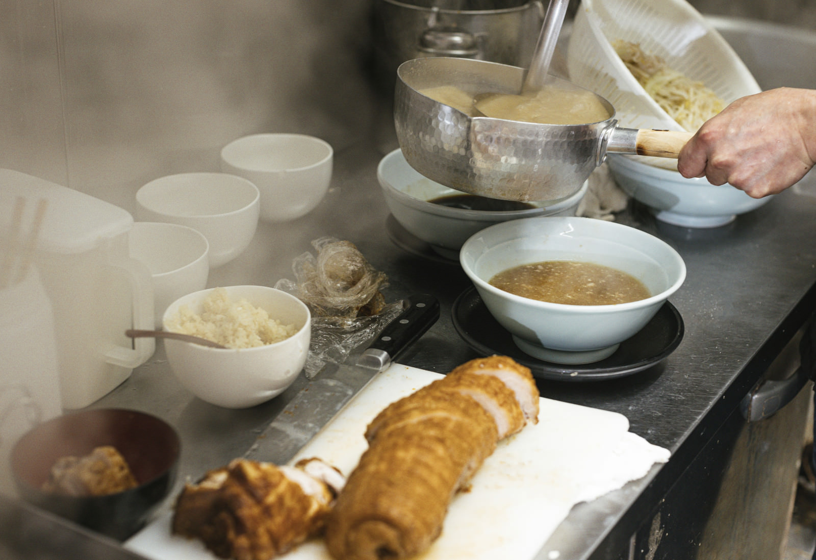 ラーメン厨房でスープとチャーシューを調理する風景の写真素材です。白いボウルに入ったスープやチャーシューが並び、シェフの手元で丁寧に調理が進められ、厨房の作業風景がリアルに記録されています。ラーメン店のWebサイトや飲食店の宣伝、料理ブログなどにおすすめです。