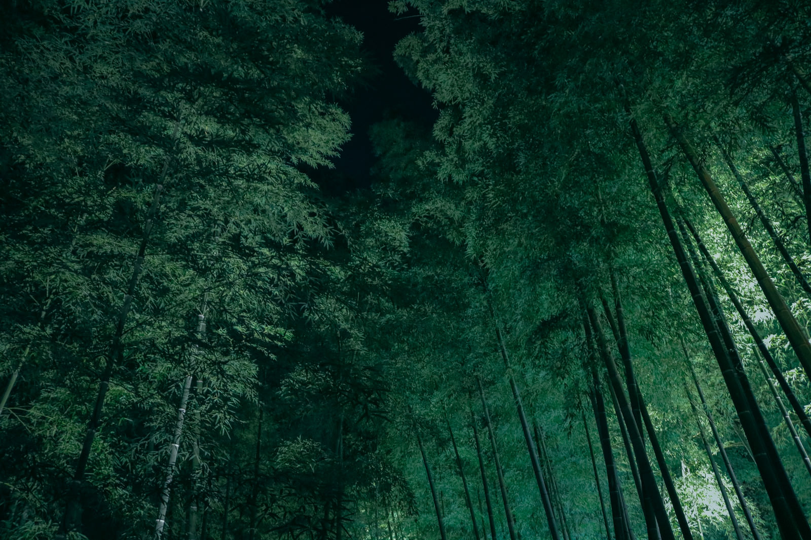 夜間にライトアップされた竹林の写真素材です。地面から見上げたアングルで、照らされた竹の幹が左右に並び空へ伸びている。和風のウェブサイトや広告バナーの背景素材に使いやすい写真です。