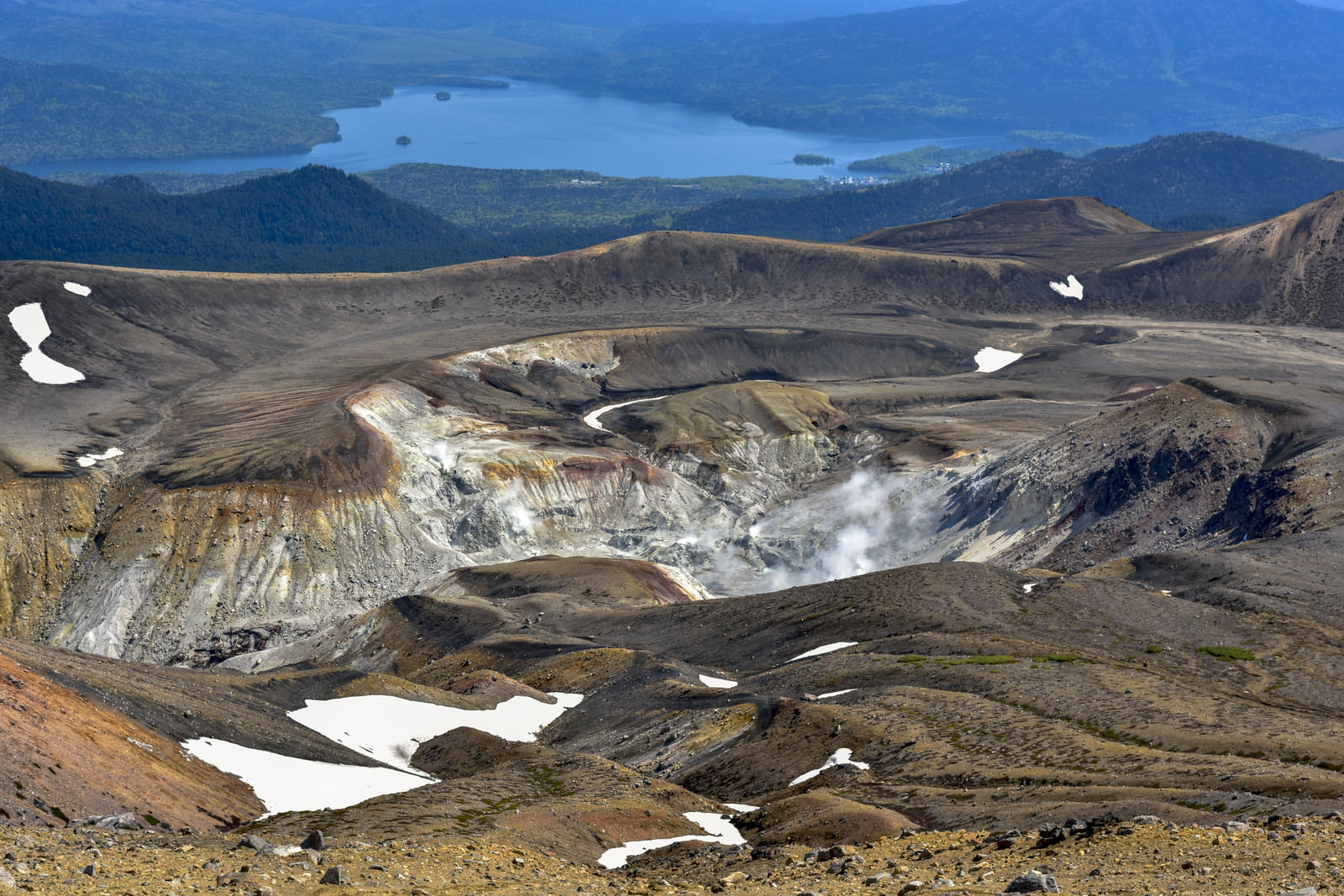 雌阿寒岳の荒涼とした大地の写真素材です。火山活動によって形成された茶褐色の荒地が広がり、現在も活火山として活動を続ける雌阿寒岳の火口周辺では硫黄ガスが立ち込めています。登山や火山に関するWebサイト、旅行ブログ、自然をテーマにしたデザイン素材などにおすすめです。