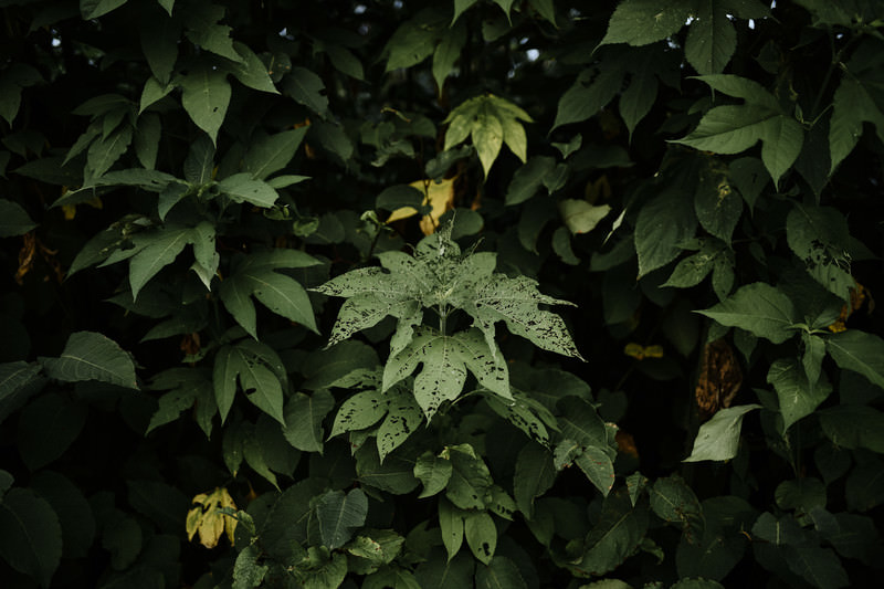虫食いの葉が茂る野草の写真素材です。濃い緑色の葉が密集し、虫食いによる穴や欠けた跡が複数見られ、葉っぱの複雑な食害痕が自然界における生命の営みを記録しています。自然やエコロジー、生態系をテーマとした記事やコンテンツ制作におすすめです。