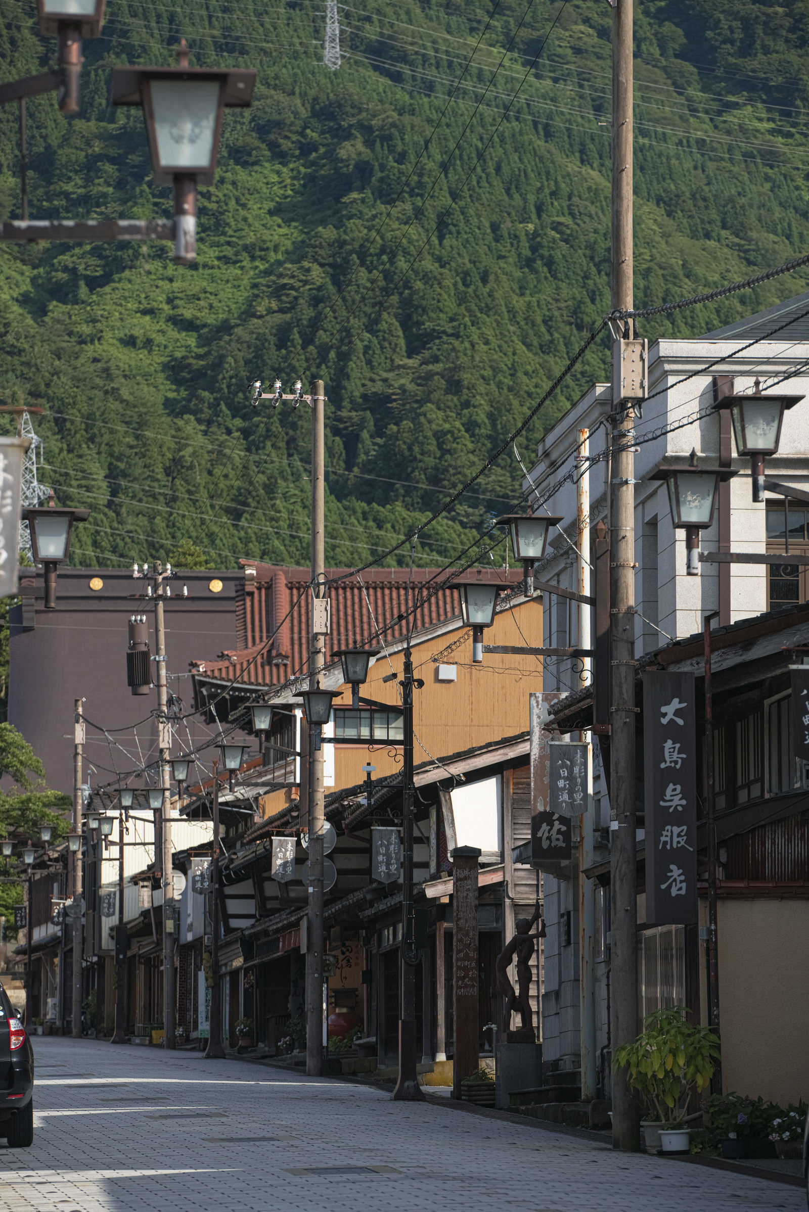 南砺市の八日町通りで軒を連ねる街並みの写真素材です。石畳の道沿いに古い建物が立ち並び、電柱や電線が見える昔ながらの風景が広がります。地域の観光情報発信や歴史的な街並みを紹介するコンテンツ、建築・町並み関連の記事などにおすすめです。