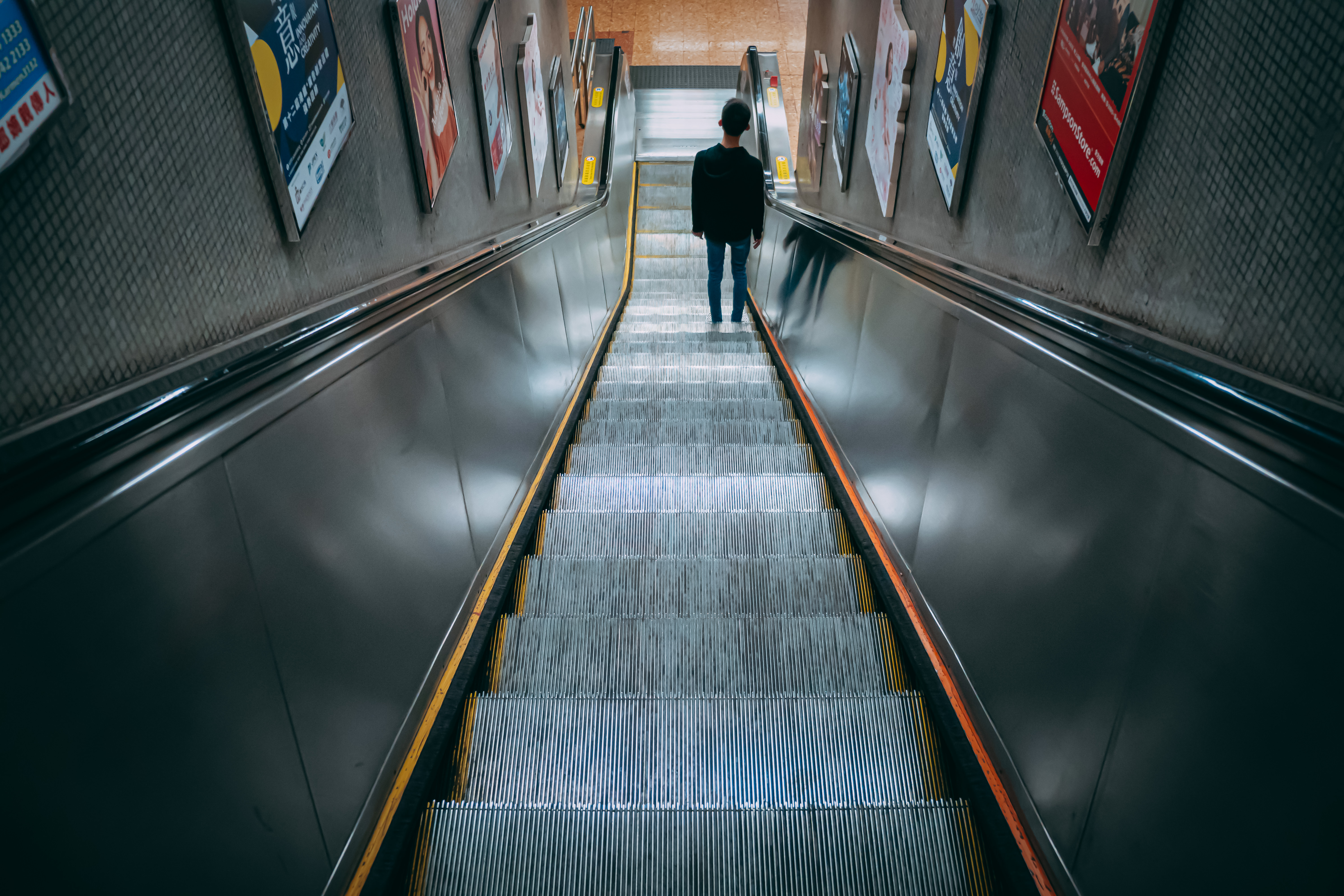 香港の地下鉄駅でエスカレーターを降りる男性の後ろ姿の写真素材です。無機質で照明が明るい地下空間で、一人の男性がエスカレーターを下へ進み、ホームへ向かっています。都市生活や通勤ラッシュ、駅での日常風景を表現するデザインに最適です。
