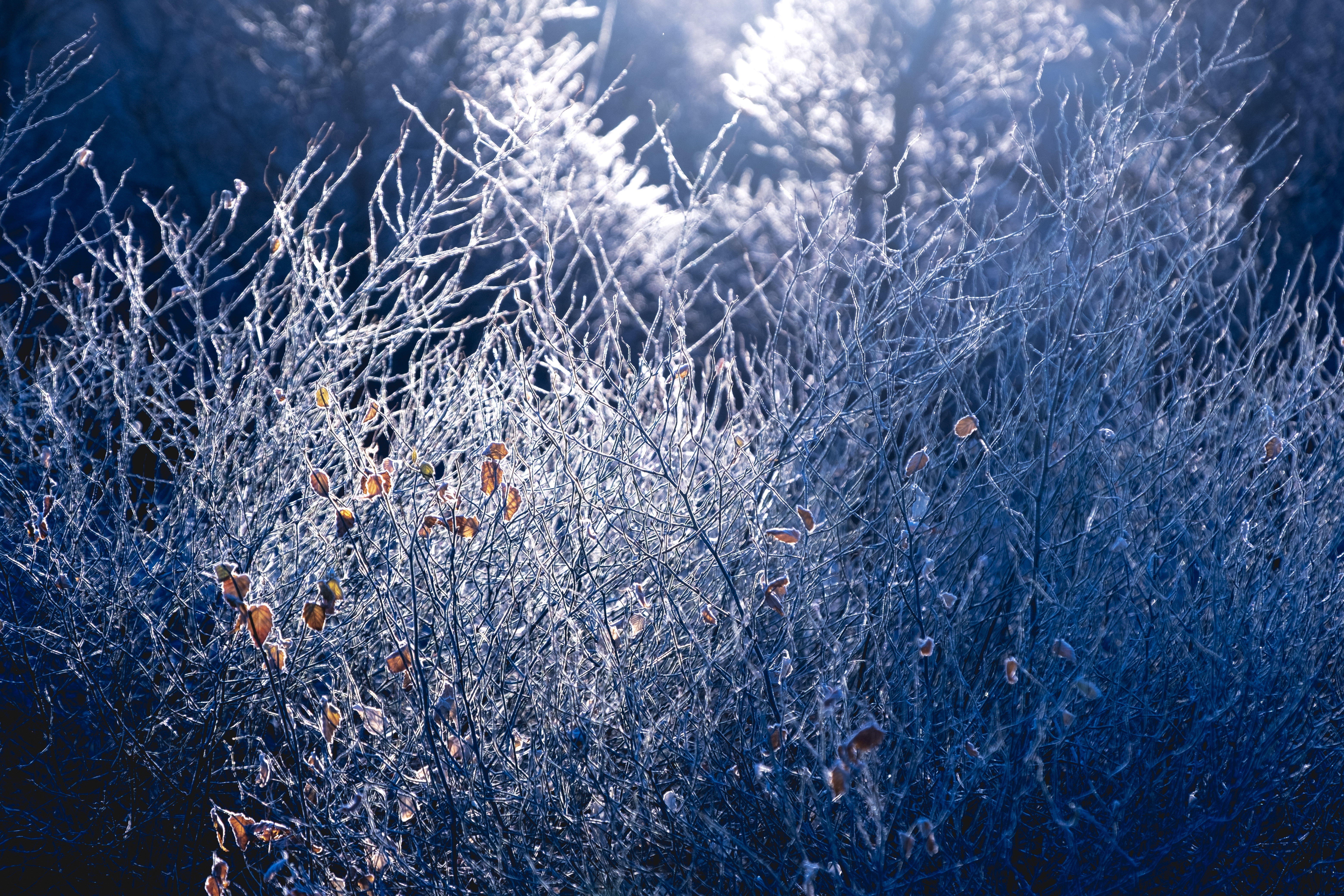 太陽光を受けて輝く霧氷が付着した農地の写真素材です。細い草木や農地全体に白い氷の結晶が覆い、朝日を反射してキラキラと輝く、冬の寒冷地ならではの風景が特徴です。冬の季節表現や自然風景、農業風景などの素材として活用できます。