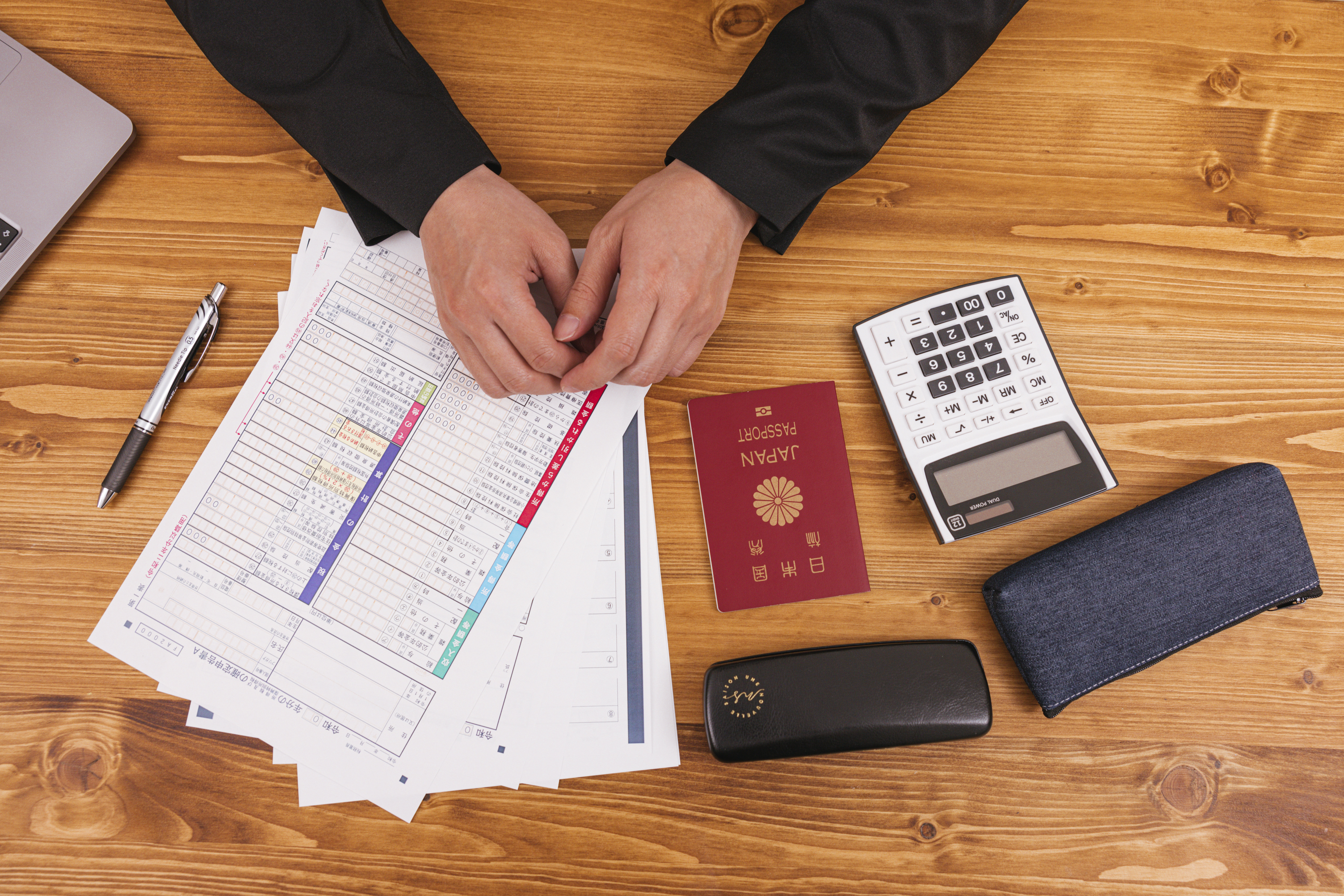 年末調整と確定申告の書類作りの写真素材です。木製のテーブルの上に電卓やペン、書類、パスポートなどが配置され、経理業務に必要な各種書類が整理されている状態です。税務申告準備の実務風景が撮影されており、税務申告や経理業務、決算準備のコンテンツ制作などにおすすめです。