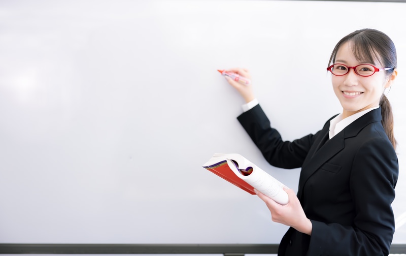 ホワイトボード前で笑顔を見せる赤い眼鏡の女性講師の写真素材です。黒いスーツを着た女性が赤い眼鏡をかけ、ホワイトボードの前に立ちながら笑顔で講演やプレゼンテーションを実施しています。セミナーや研修、企業研修の資料作成におすすめです。