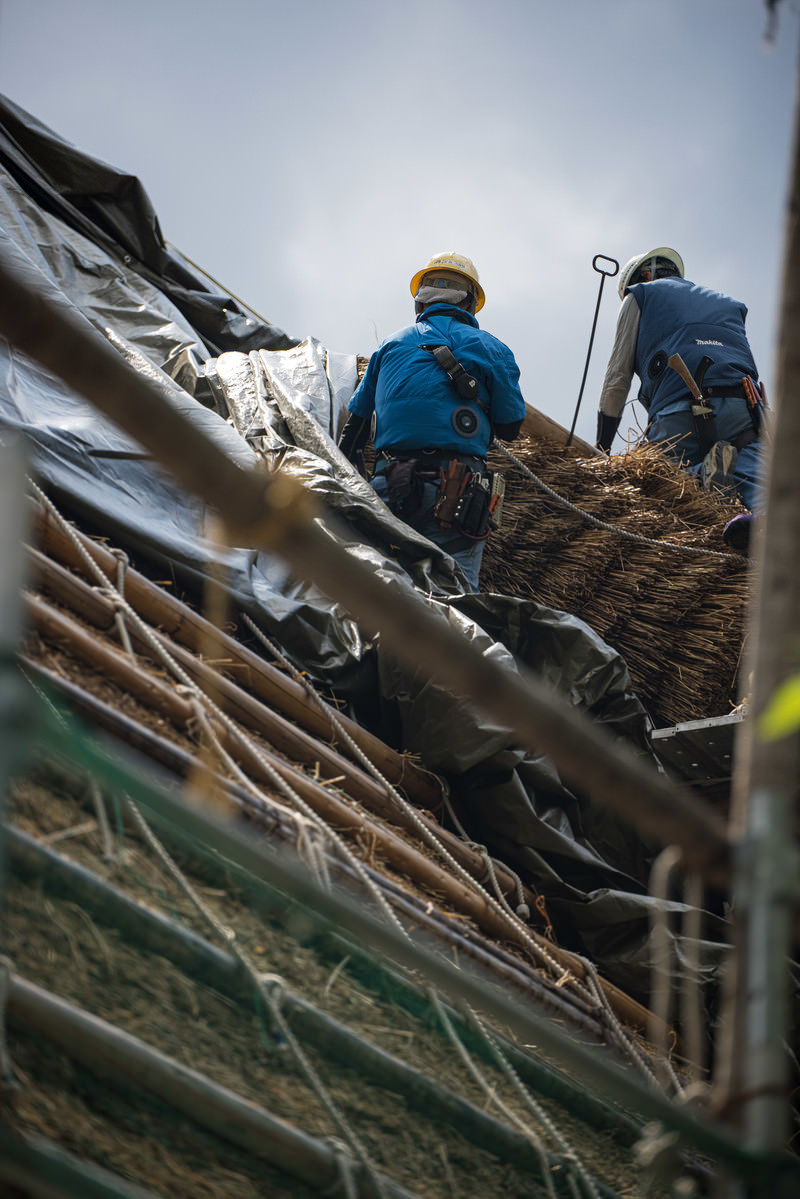 茅葺屋根の葺き替え工事を行う職人の写真素材です。青い作業着を着た職人が急勾配の合掌造り建築に上がり、伝統的な茅葺き技術で丁寧に作業しています。伝統工芸や職人技術の紹介、文化遺産に関するコンテンツ制作などにおすすめです。