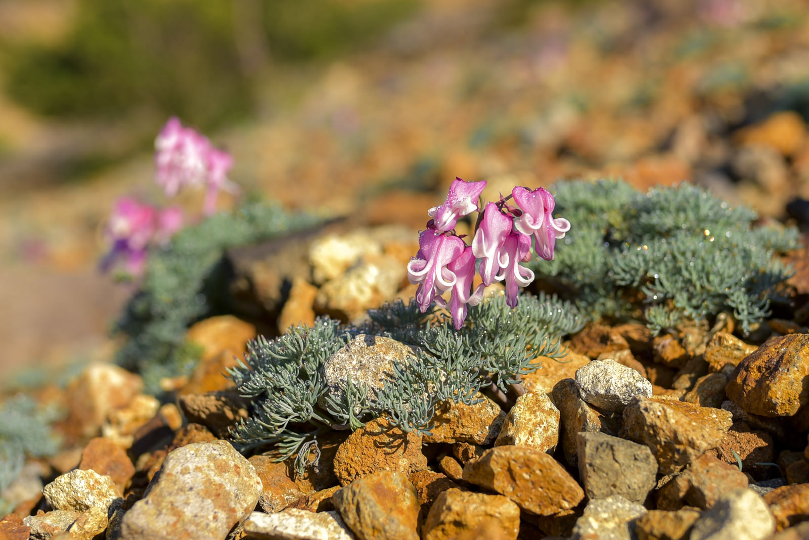 火山性の大地に咲くコマクサの写真素材です。ピンク色の小さな花が岩場に点在し、背景には茶色や緑の苔むした岩石が広がっており、草津白根山の火山地帯に生育するコマクサが記録されています。登山や自然観察のコンテンツ、高山植物の紹介、日本百名山関連の記事などにおすすめです。