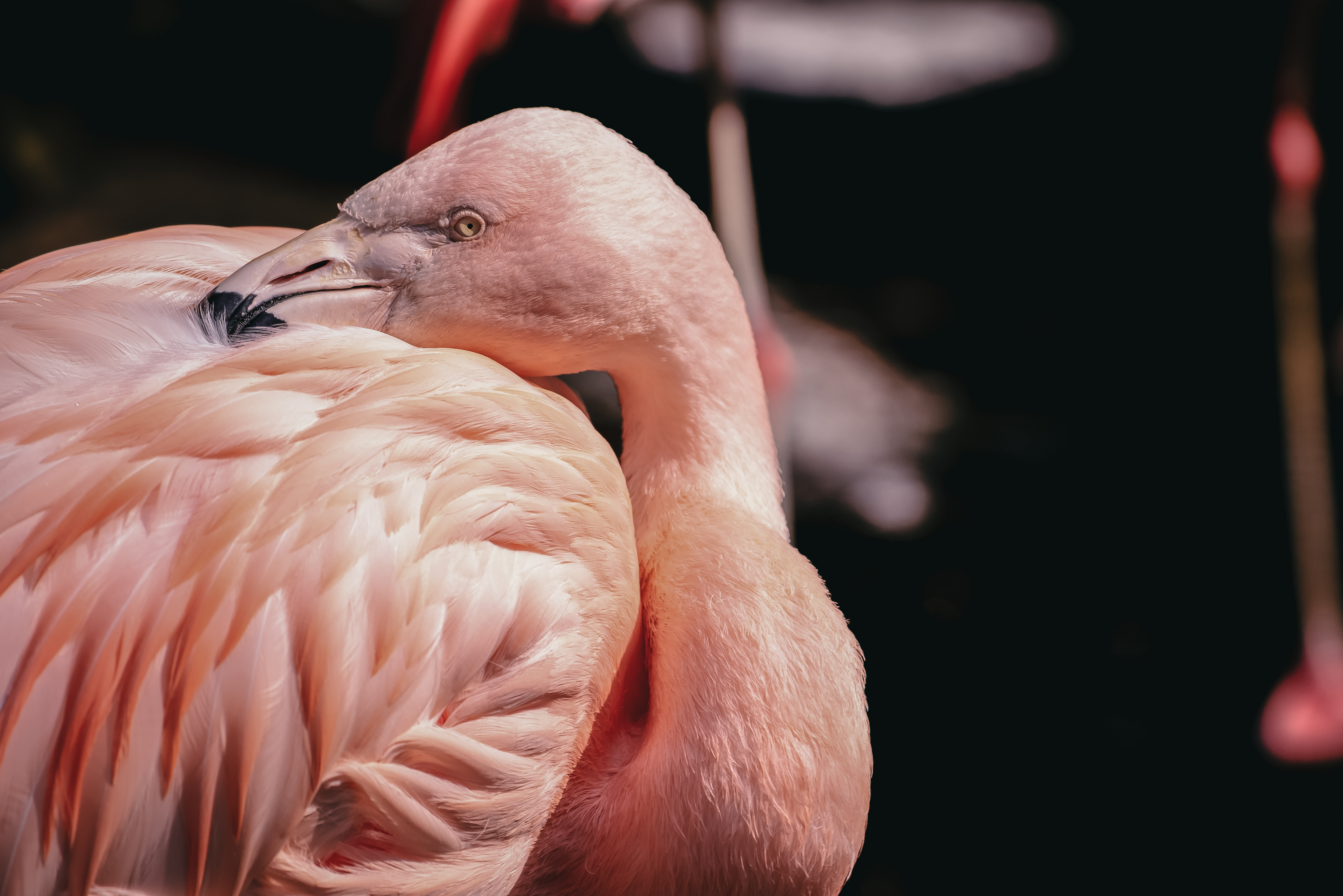 フラミンゴの写真素材です。ピンク色の羽毛に覆われた体で、首を立てて周囲を見つめる凝視する姿が写されており、くちばしと瞳が鮮明に映っています。動物園の案内や野生動物の紹介、鳥類図鑑などにおすすめです。