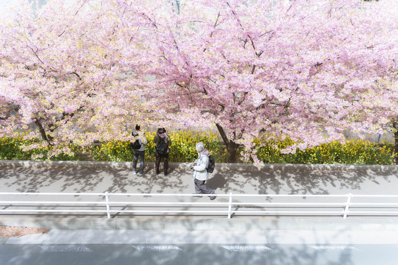 People viewing the cherry blossoms of fully bloomed Kawazu sakura