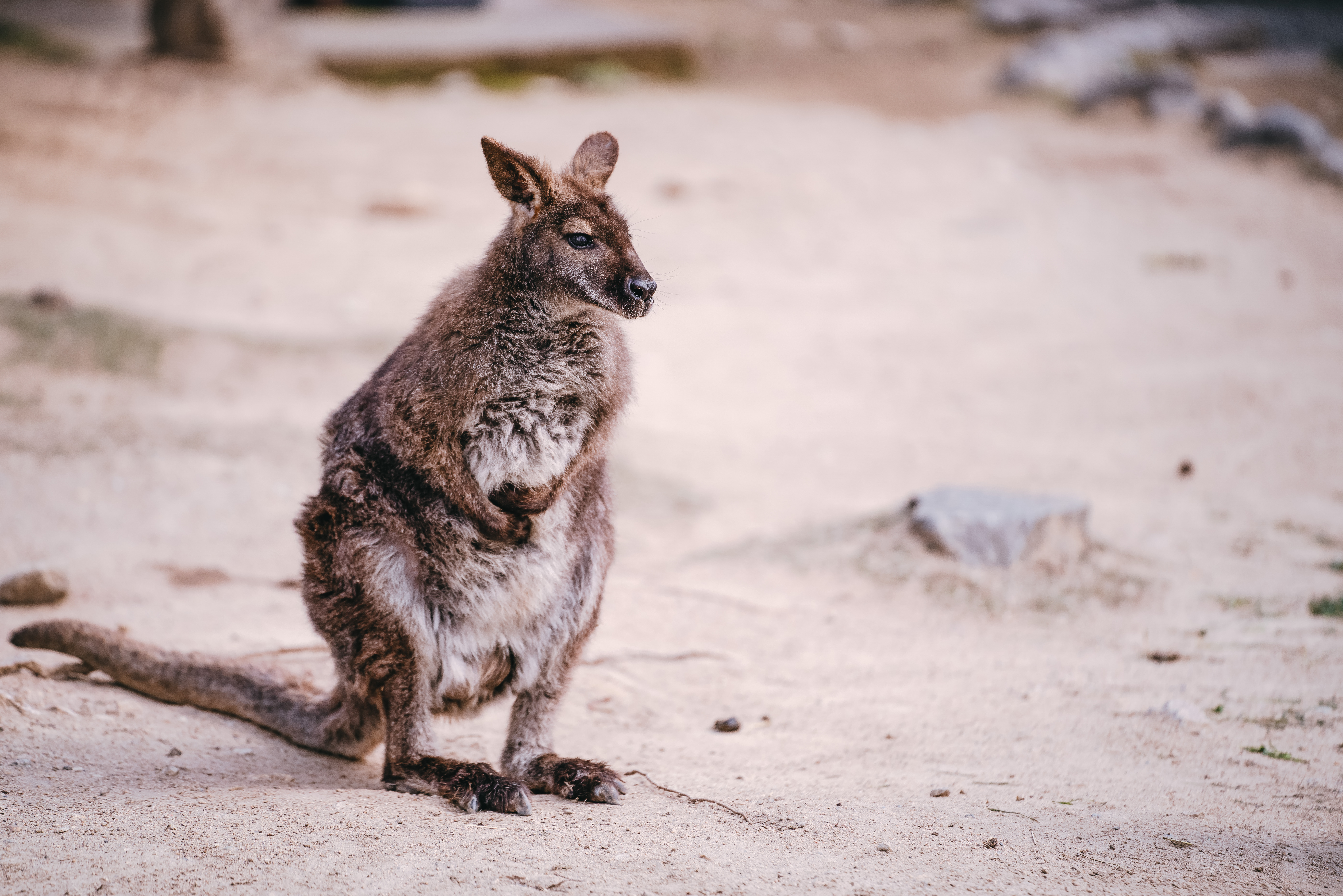 砂地に座り込むカンガルーの写真素材です。茶色い毛色のカンガルーが砂の上に座り、腹痛や過労によるストレスで苦しい表情を浮かべています。体調不良や疲労をテーマとしたコンテンツに活用できます。