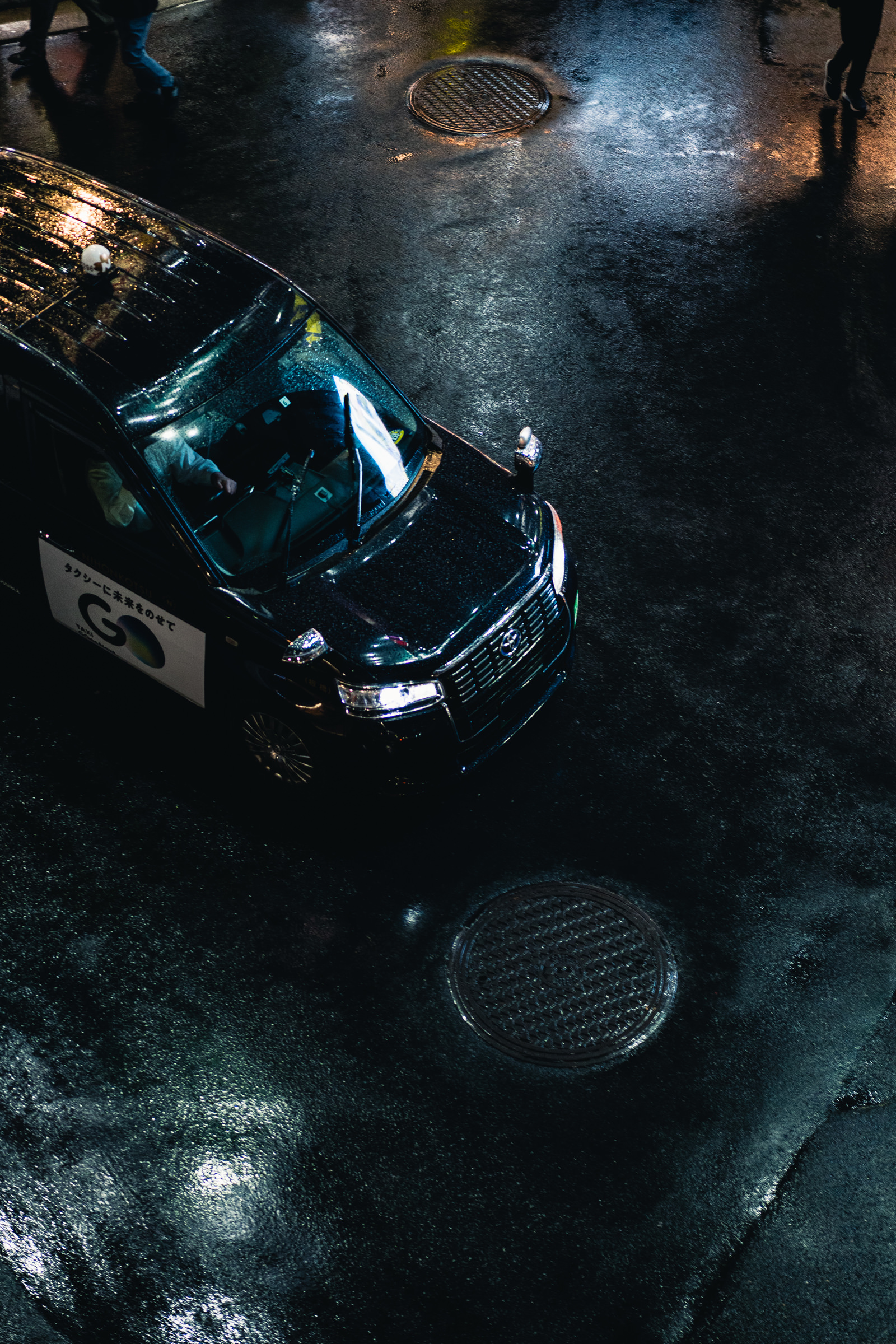 雨上がりの濡れた路面とタクシーの写真素材です。夜間の街で雨に濡れた舗装路面に停まるタクシーのヘッドライトが水面に映り込み、光と影のコントラストが特徴的なシーンとなっています。雨の日の交通風景や都会の夜間シーン、天候関連のコンテンツ制作におすすめです。