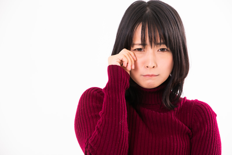 もうすぐ泣きそうな女性の写真素材です。赤いセーターを着た女性が手で顔を覆い、涙を流しそうな悔しさや悲しみに満ちた表情をしています。感情表現やWebサイト、ブログ記事の心理描写素材として活用できます。