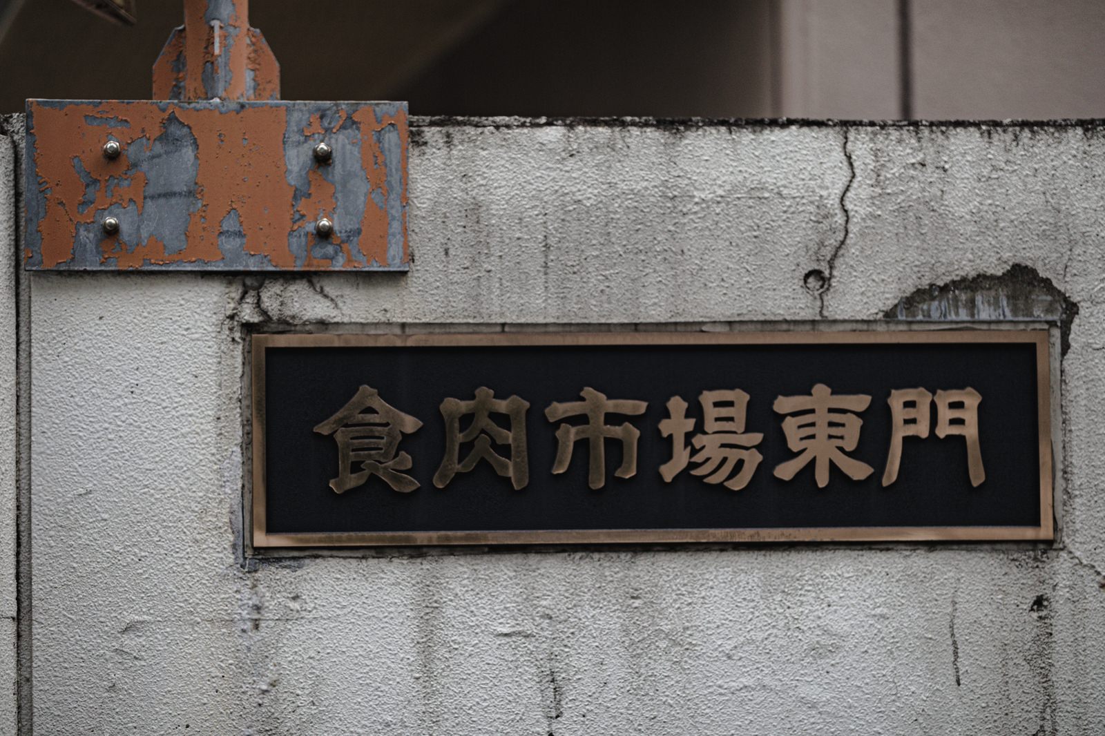 コンクリート壁に取り付けられた「食肉市場東門」と書かれた金属製の看板の写真素材です。黒地に金色の文字が刻まれ、周囲の壁にはひび割れや錆が目立つ。老朽化した施設や食の流通・市場を扱うコンテンツにおすすめです。