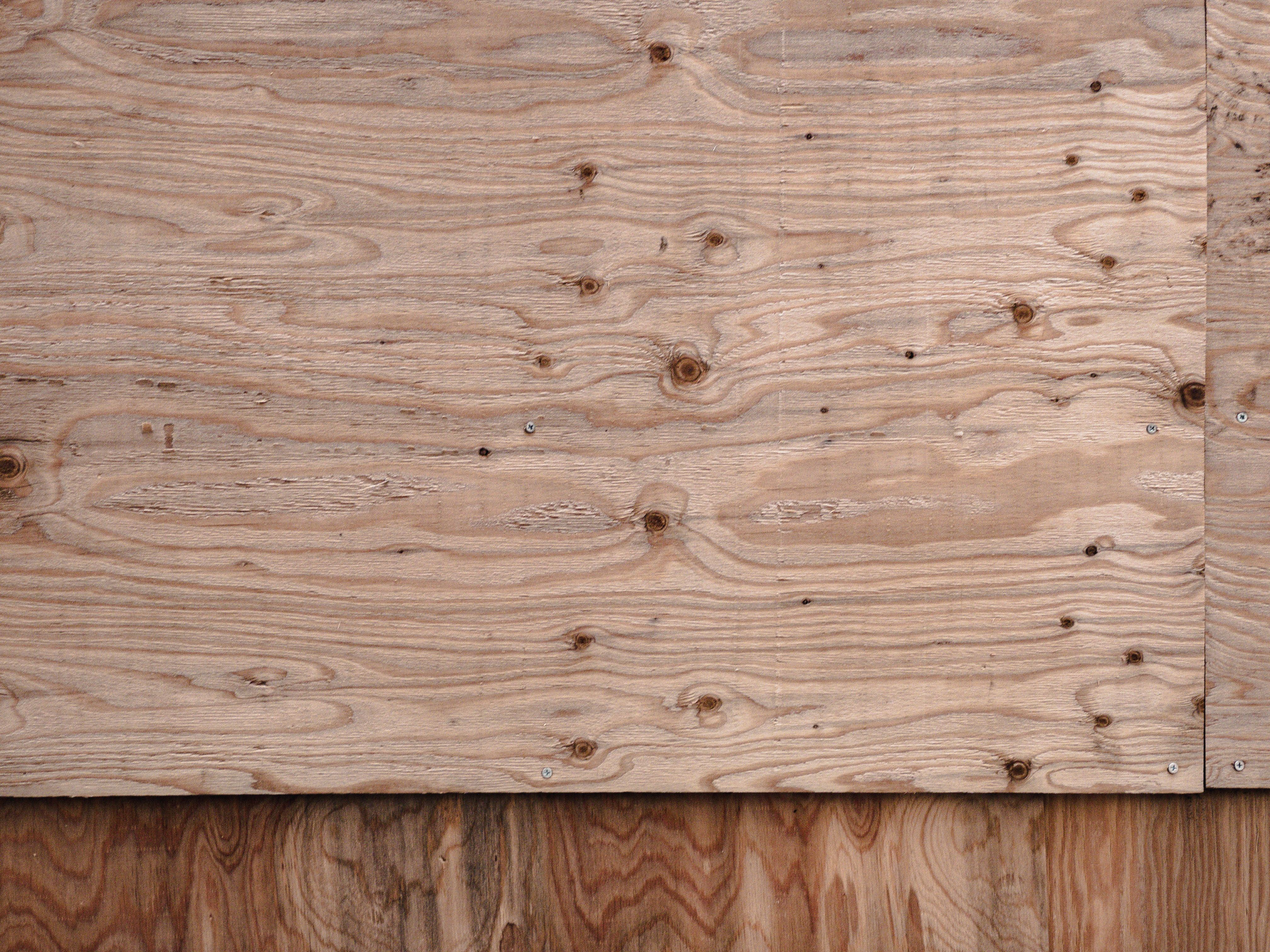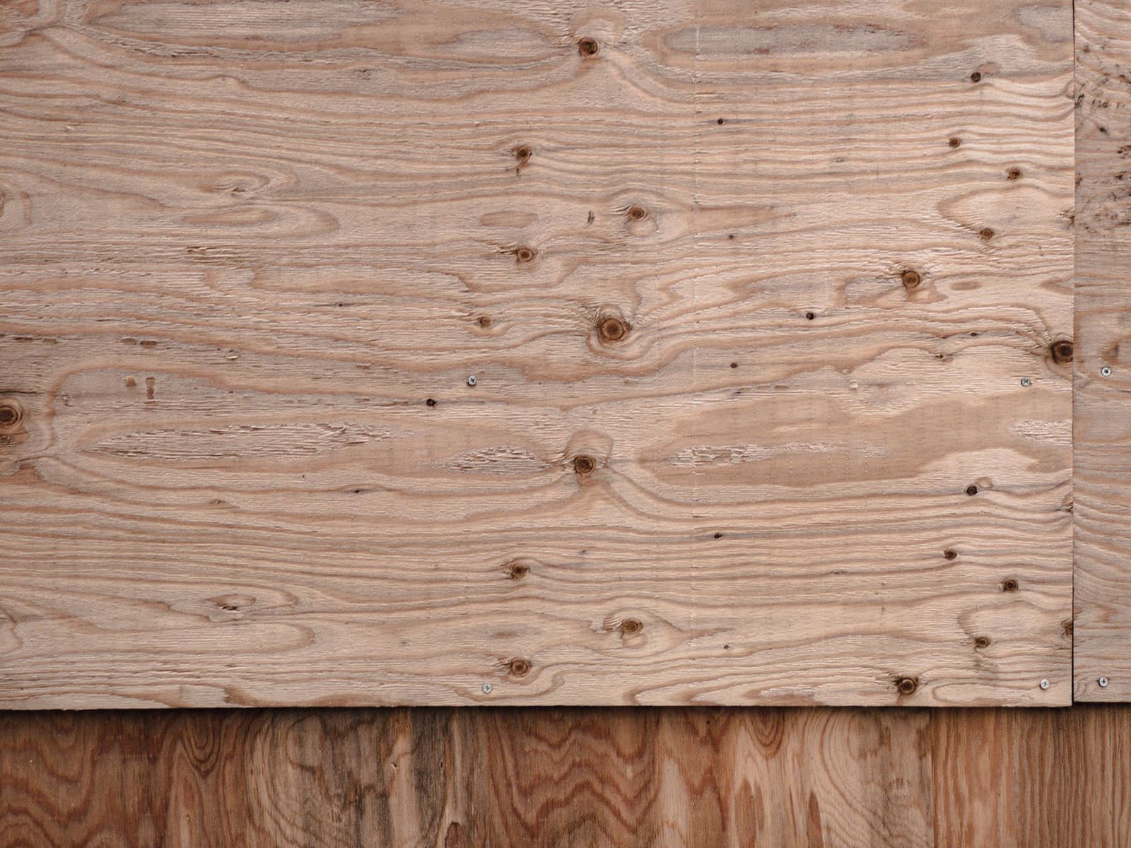 壁に張られたベニア板の写真素材です。水平に配置された板材には天然の木目パターンが見え、釘や金具で固定されている状態が特徴。建築や内装のデザイン、工業系の背景、テクスチャー素材などにおすすめです。