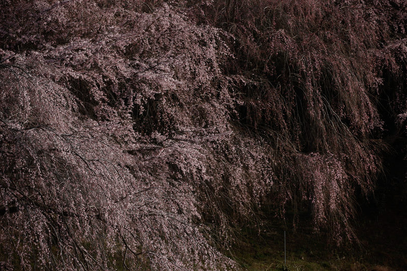 福島県郡山市の天神夫婦桜の写真素材です。樹齢が古い一本桜で、淡いピンク色の花が枝いっぱいに咲き誇り、細い枝の先端に密集して開いています。背景には暗い樹木が配置されており、桜の名所紹介、春の観光PR、花見シーズンのWebサイトやブログなどにおすすめです。