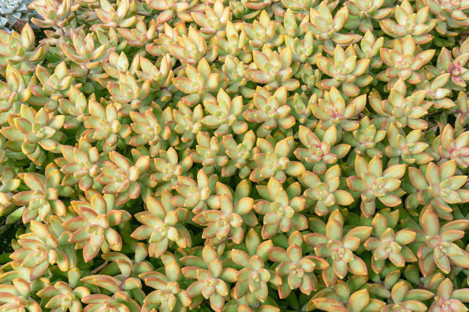 みっちりと隙間なく植えられた多肉植物の写真素材です。小さな肉厚の葉が密集し、放射状に広がる様子が見られます。緑色を基調とした自然なテクスチャーを形成しており、ガーデニング関連のコンテンツ制作や、植物をテーマとした背景素材として活用できます。