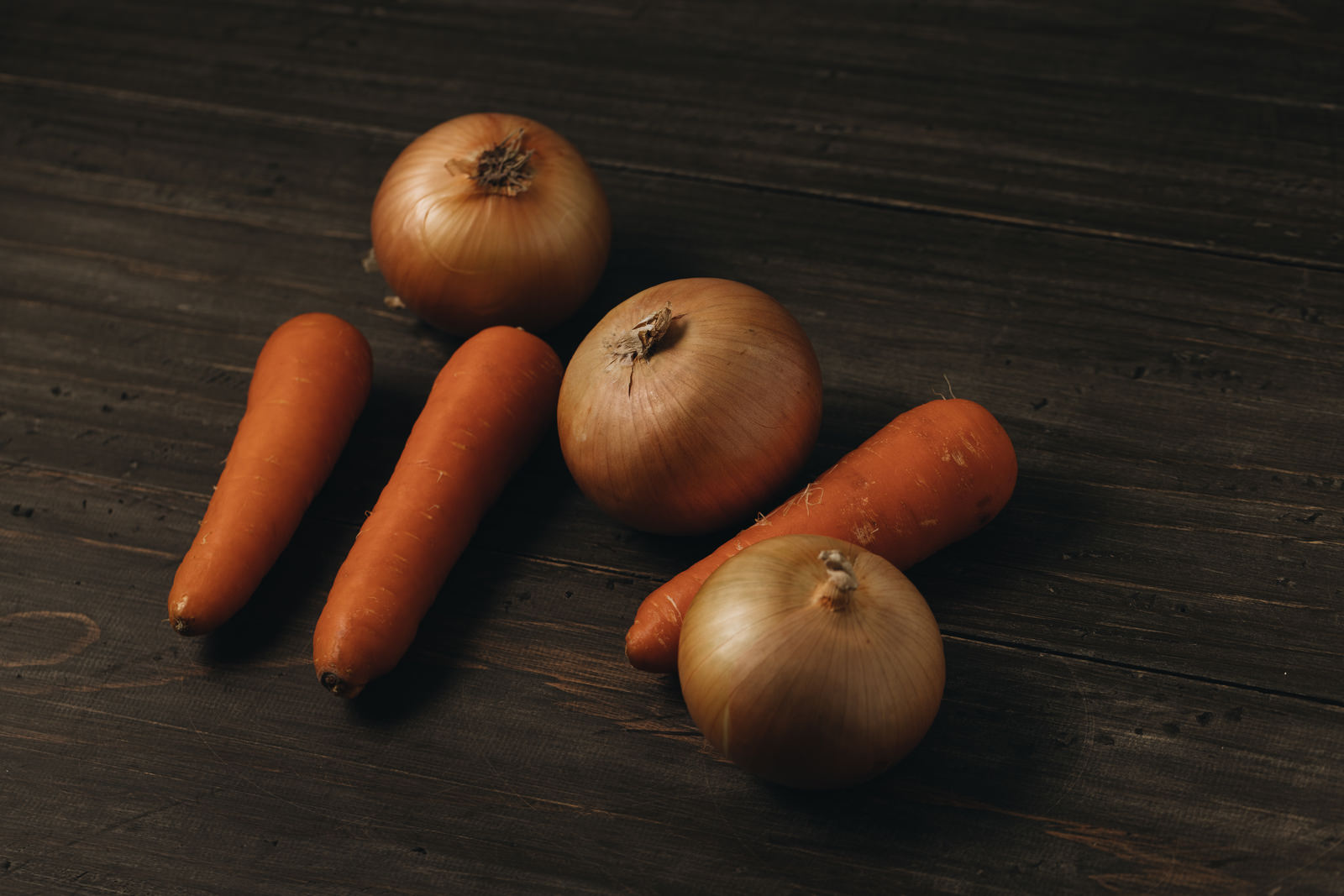 暗い木目の表面に無造作に置かれた人参と玉葱の写真素材です。オレンジ色の人参3本と茶色の玉葱3個が自然に配置され、素朴で温かみのある食卓の雰囲気を表現しています。料理ブログや食材紹介、レシピサイト、飲食関連のコンテンツ制作などにおすすめです。