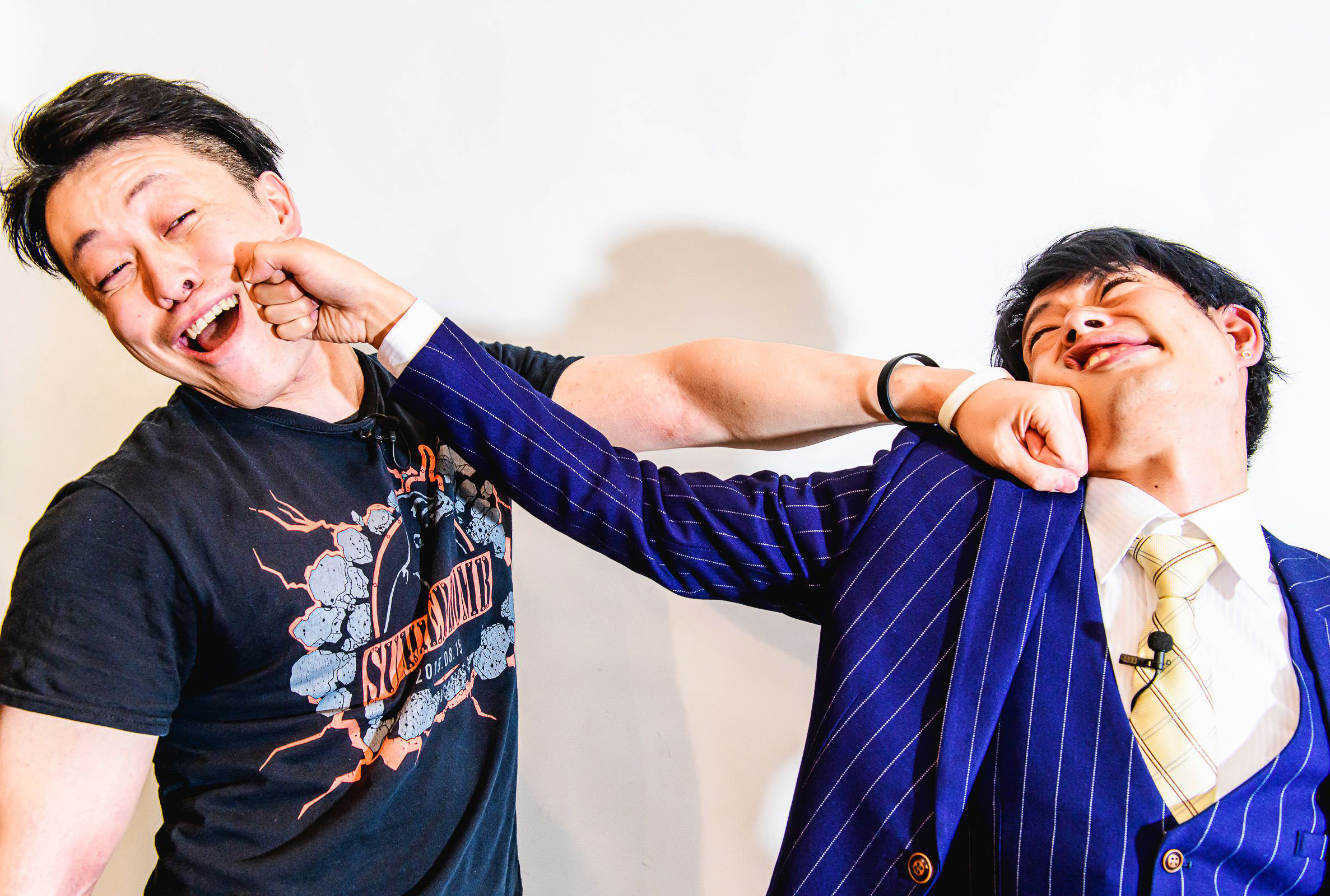 クロスカウンターが決まる喧嘩の写真素材です。男性同士が殴り合いを繰り広げており、両者の拳が同時に交差しながら、一方の拳が相手の顔面に当たっている瞬間を表現しています。格闘技や暴力的なシーンを表現するコンテンツ制作などに活用できます。