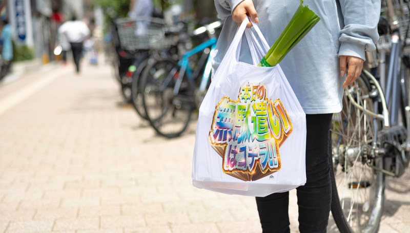 エコバッグを手に持って買い物をする人の写真素材です。白いエコバッグにはカラフルなデザインが描かれており、背景には自転車が並んでいます。環境への配慮を重視したショッピングシーンや持続可能なライフスタイルをテーマとしたコンテンツ制作におすすめです。