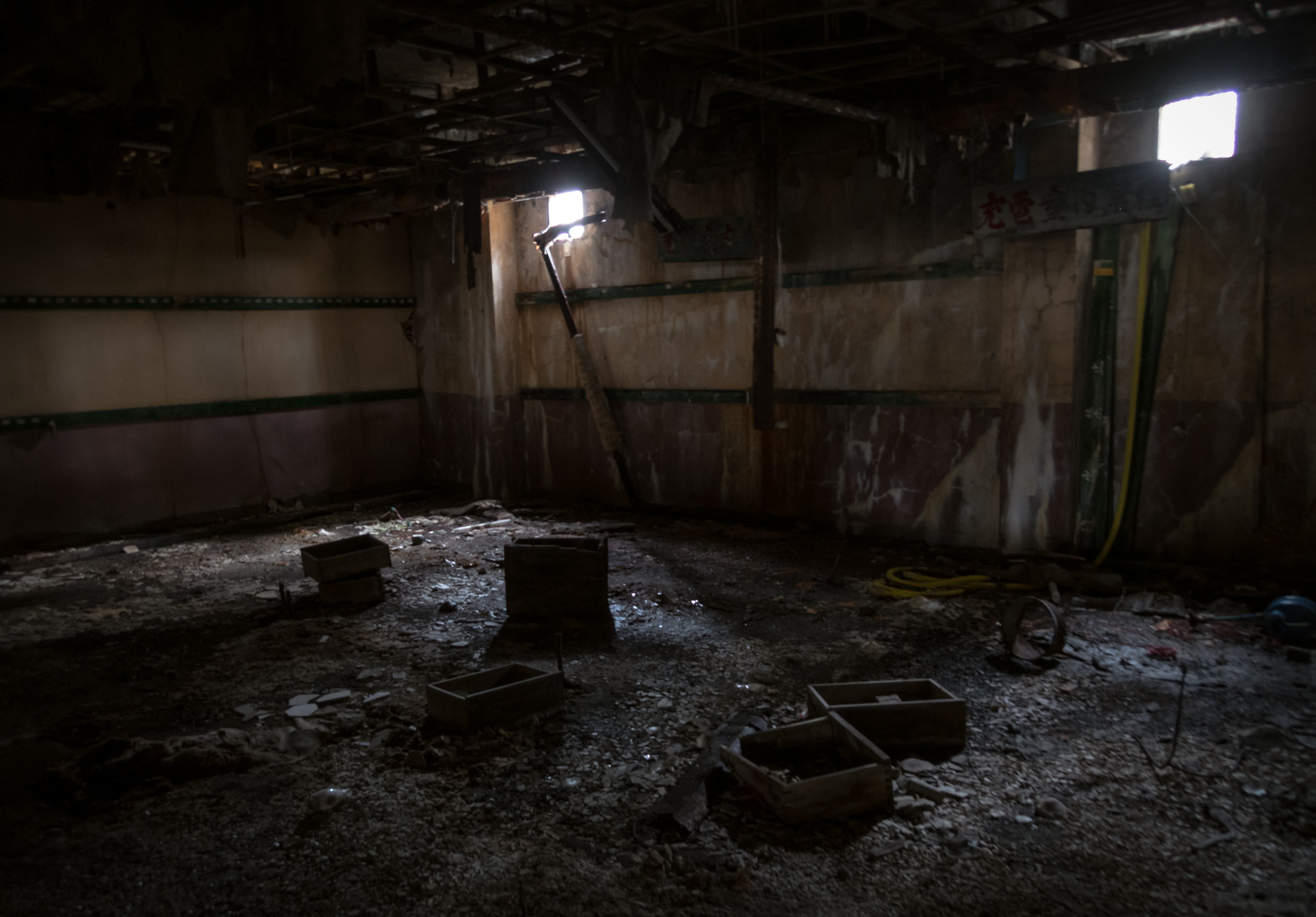 荒廃した建物内部の写真素材です。劣化したコンクリートの壁や床が露出し、瓦礫が散乱する空間に、換気口や開口部から自然光が差し込んでいます、破損したボロボロの建材が積み重なり、廃墟特有の荒廃感を強く表現しています。廃墟や建物の劣化をテーマとした作品制作やデザイン素材として活用できます。
