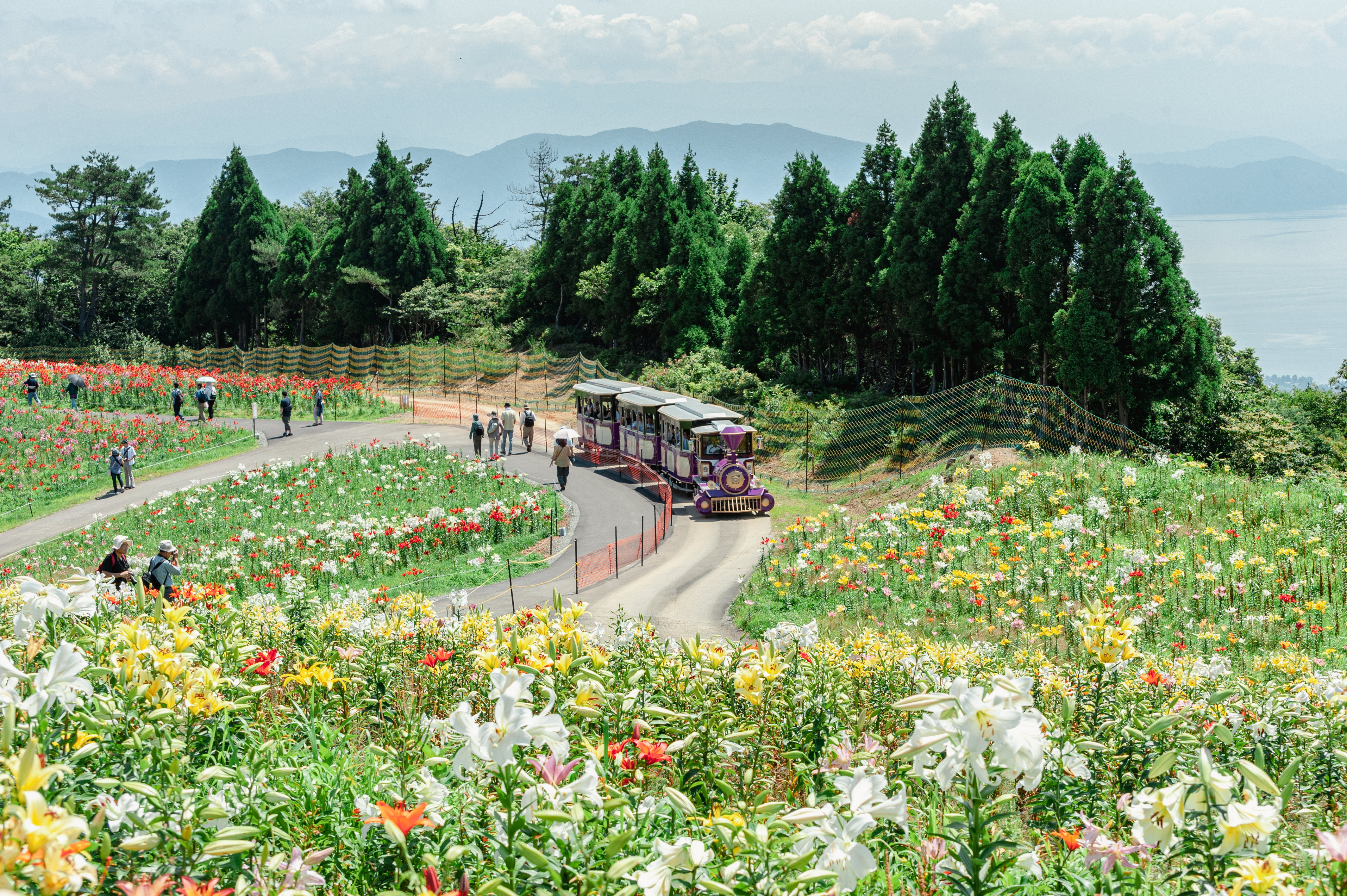 ユリ畑を走るトロッコ列車の写真素材です。赤やピンク、黄色、白など色とりどりのユリが咲き誇る花畑の中を、小さなトロッコ列車がゆっくりと進んでいます。ユリ科の花々に囲まれた観光列車の走行風景は、観光パンフレットや旅行関連の広告制作などに最適です。