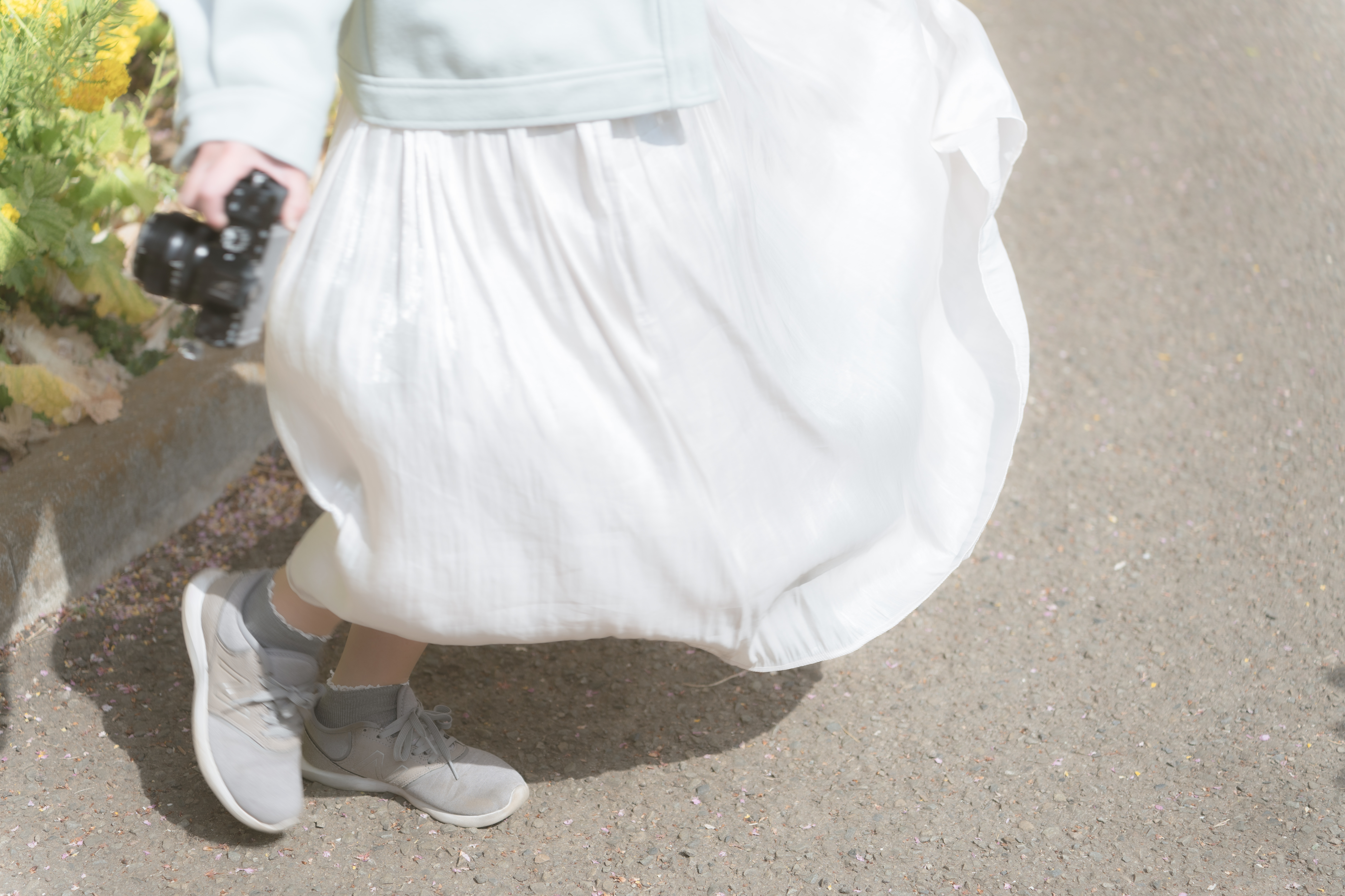 白いスカートの裾がひらめく瞬間の写真素材です。カメラを手に持った女性の足元を撮影しており、スカートの動きや布の流れが表現されています。春のファッション関連やカメラ女子向けのコンテンツにおすすめです。