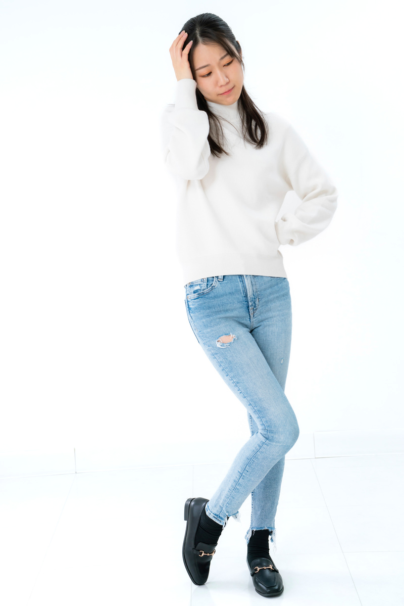 足をくねらせて困惑する女性の写真素材です。白いニットとジーンズを着用した女性が、片手を腰に当てながら困った表情を浮かべ、足をくねらせて立っています。自然な困惑表現を表現した素材で、Webサイトのヘッダー画像や広告素材、ブログのアイキャッチなどにおすすめです。