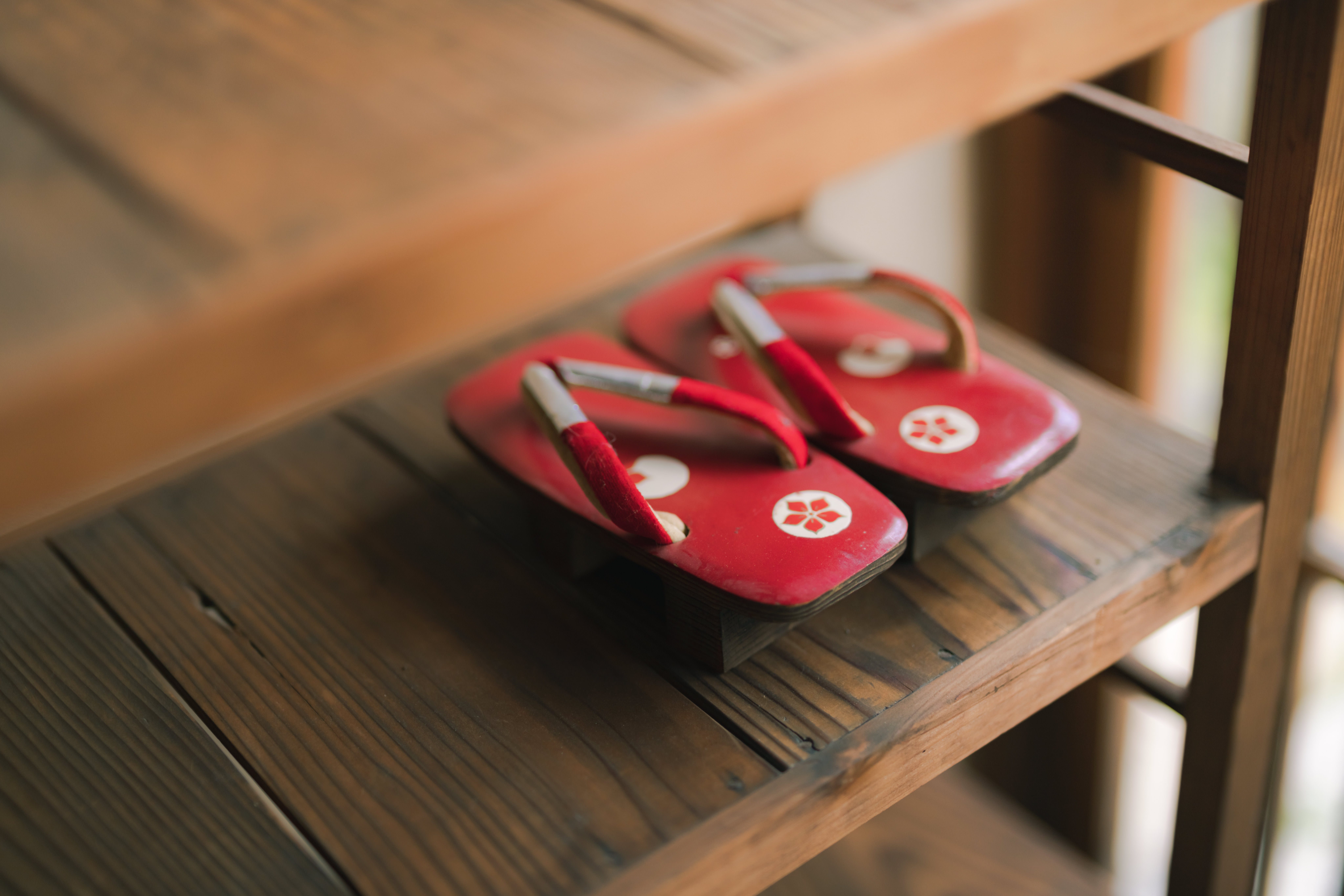 下駄箱に入った女性用の赤い下駄の写真素材です。鮮やかな赤色の鼻緒を持つ下駄が木製の下駄箱に整然と置かれ、玄関に日本の伝統的な履物の風情をもたらします。和風のデザインや日本の伝統文化、玄関周りのコンテンツなどにおすすめです。