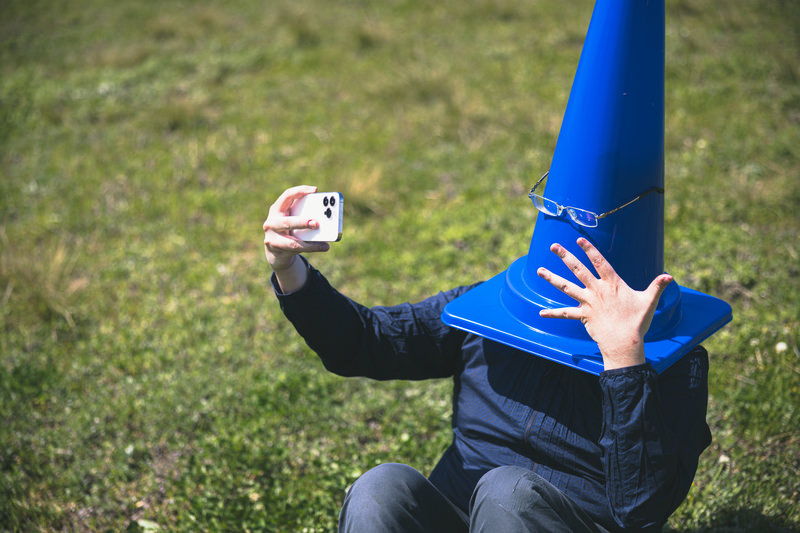ノリノリで自撮りするカラーコーン男子の写真素材です。青いカラーコーンを被った人物が芝生の上でスマートフォンを持ち、楽しそうに自撮りしている様子を撮影しました。ユニークで面白いコンテンツ制作や個性的な企画、SNS投稿素材などにおすすめです。