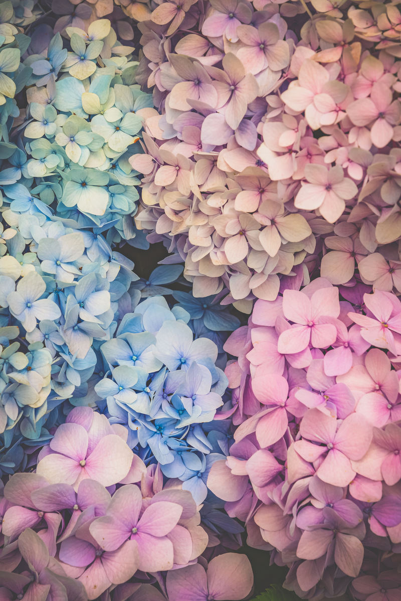 満開の紫陽花が咲き誇る花畑の写真素材です。青やピンク、紫など色とりどりの花が密集して咲いており、グラデーションのような美しい配色を見せています。初夏の季節を代表する紫陽花の壮大な景観は、壁紙やデザイン素材、季節もの記事などにおすすめです。