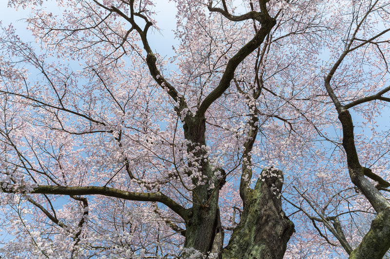見上げた弥明の桜の写真素材です。福島県郡山市の樹齢300年を超えるエドヒガン桜が満開に咲き、薄いピンク色の花が枝いっぱいに開いています。春の観光コンテンツや地域紹介サイト、桜の名所を紹介するブログなどにおすすめです。