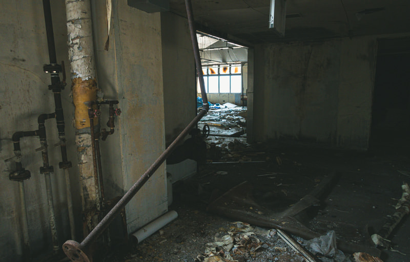 床に散らばった瓦礫とぶら下がる錆び付いた配管の写真素材です。破壊された室内空間に瓦礫が床に散乱し、天井から錆びついた配管が垂れ下がっており、建物の劣化と荒廃した状態が見て取れます。廃墟や歴史的建造物、建物の老朽化をテーマにした表現に最適です。